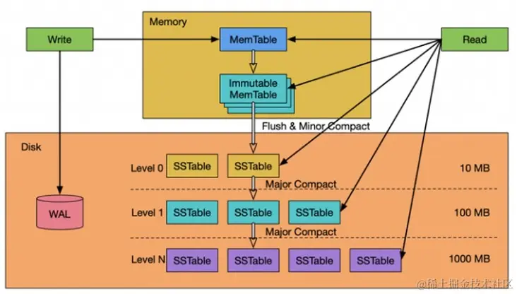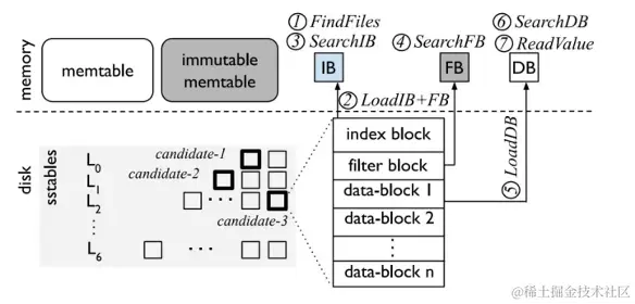 核心思路是将最新的数据驻留在缓存中,等积累到一定量后再使用归并合并的方式将缓存中的数据合并到磁盘队尾中。数据写入时先在内存中组成Mem Table,其内的数据是经过排序的数据,当达成一定程度后将其添加到LSM Tree中,这些相邻的SSTable不保证有序,在后台会启动定时任务进行合并。为了加快数据的读取,大部分的LSM结构中会基于Key的索引和Bloom Filter来快速过滤查询Key,减少IO数据的访问。读取流程如下: