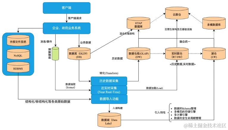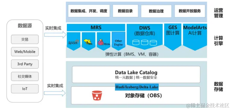 从数据流转和计算来看与大数据数仓基本相同,核心的变化在于使用数据湖存储格式,例如Hudi、Iceberg、Delta Lake等进行数据的组织,解决了数据湖松散的文件结构问题,并在此基础上提供统一的元数据管理能力,实现各种数据库和数据仓库的元数据无缝打通和管理。