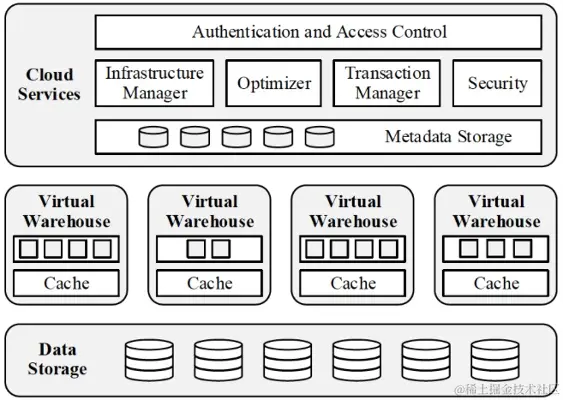 数仓在云端提供服务可以利用公有云强大的基础设施能力(弹性计算、存储、网络及安全能力),同时让用户更加轻松将数据进行集成,并降低使用、维护与架构成本。这就产生了云数仓(基于云原生的数据仓库),业界没有明确的定义,但是Snowflake是云数仓的里程碑产品,目前出现的云数仓产品很多都会借鉴该产品的设计思想,架构如下图所示: