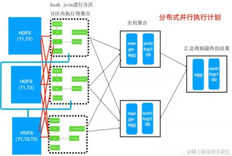 分布式并行执行计划是在单机执行计划的基础上,结合数据分布式存储的特点,将其拆分为多个子任务,每个子任务都是可以并行执行,待执行后将结果进行全局的聚合。