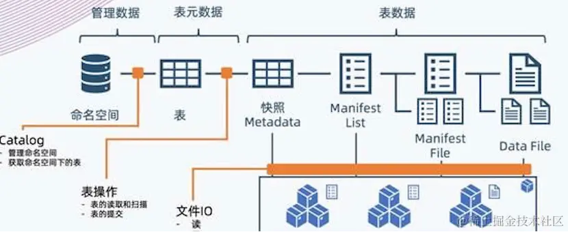 数据湖存储格式是湖仓运行的核心,其通过良好的抽象对接数据存储和元数据管理,格式如下图所示: