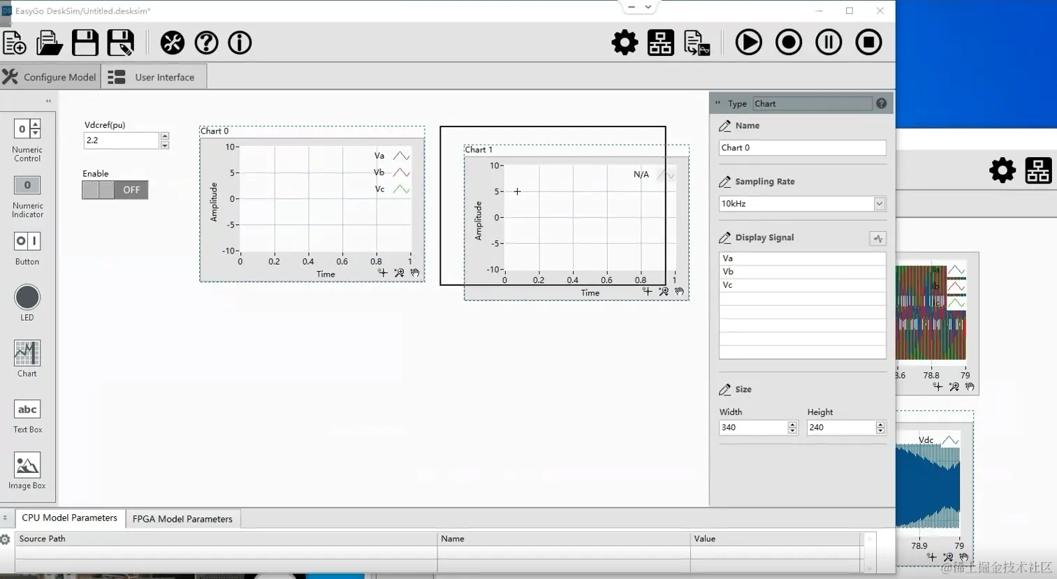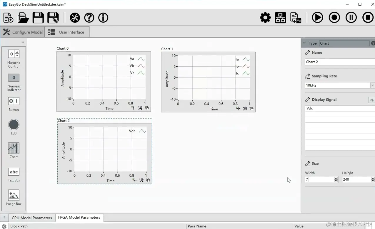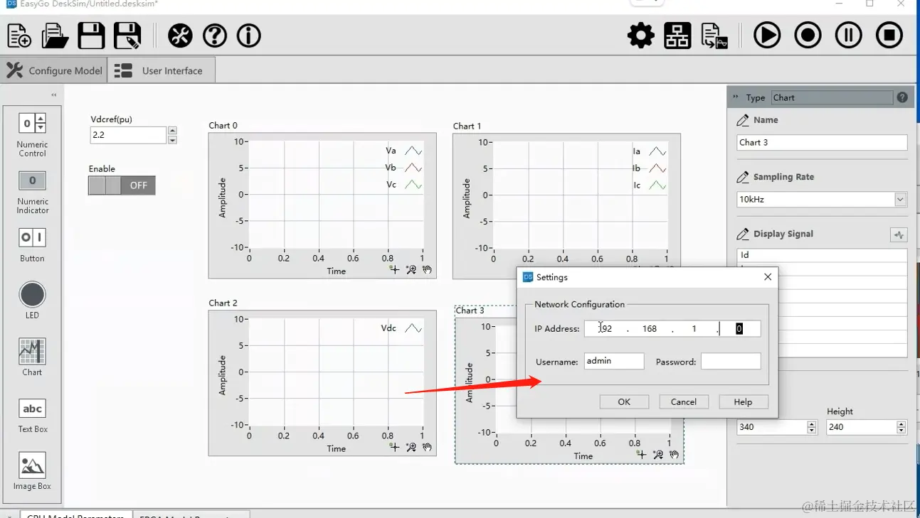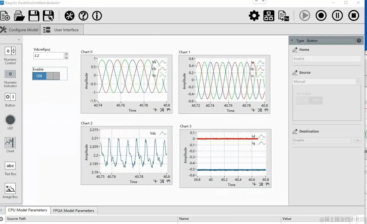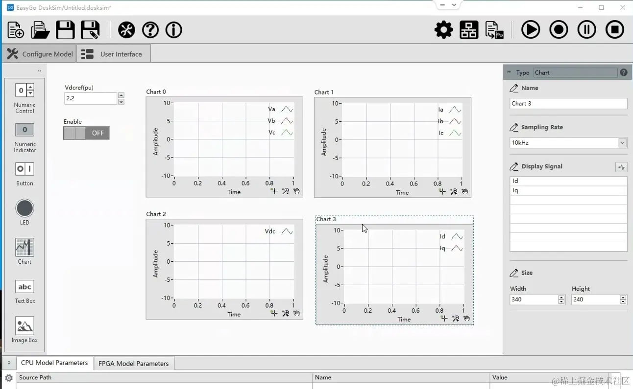 编译完成后,切换到User Interface界面,拖入一个控件,对应到算法的直流电压给定值,设置默认值2.2;再拖入一个控件,对应到算法的使能信号。