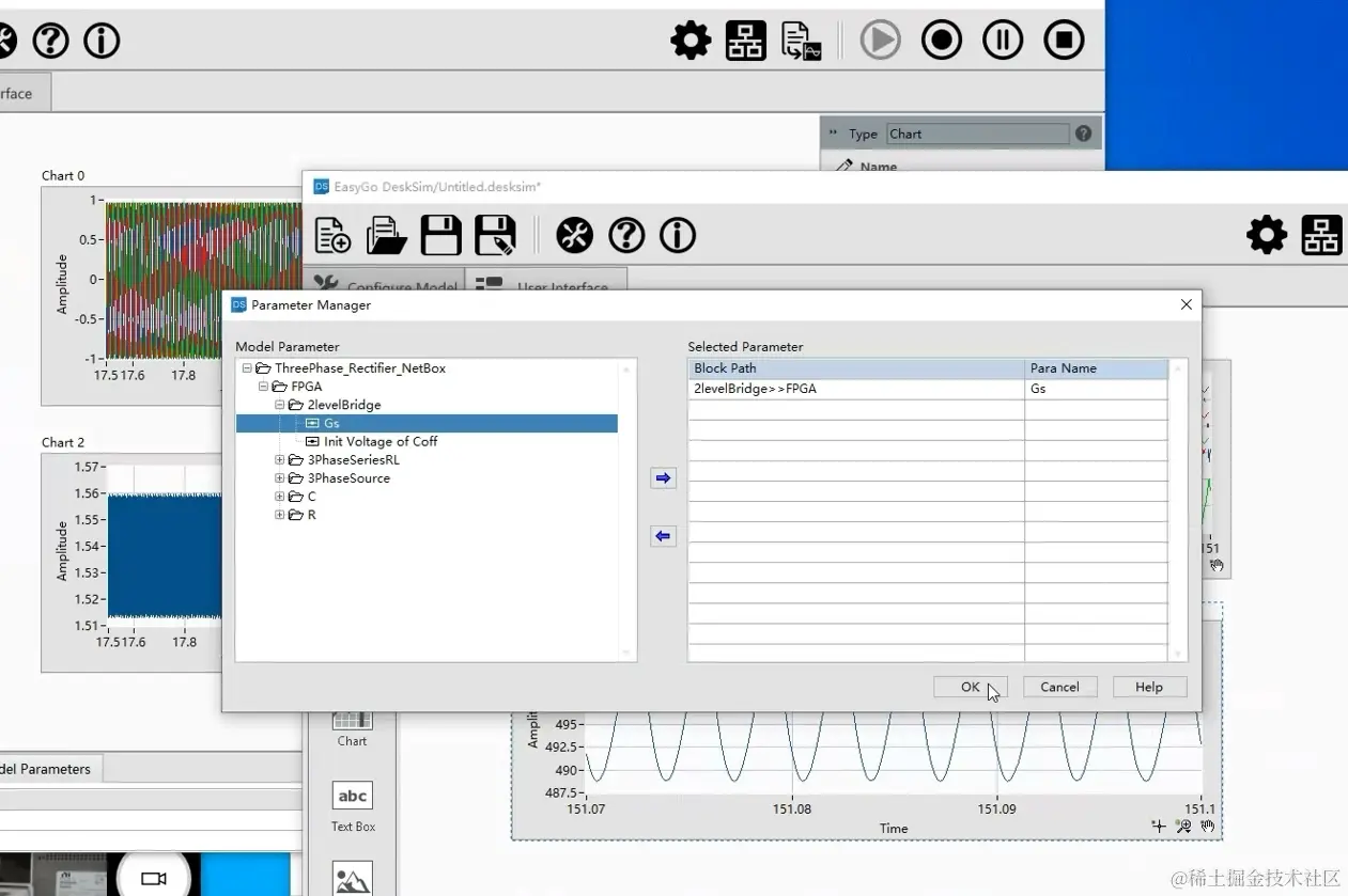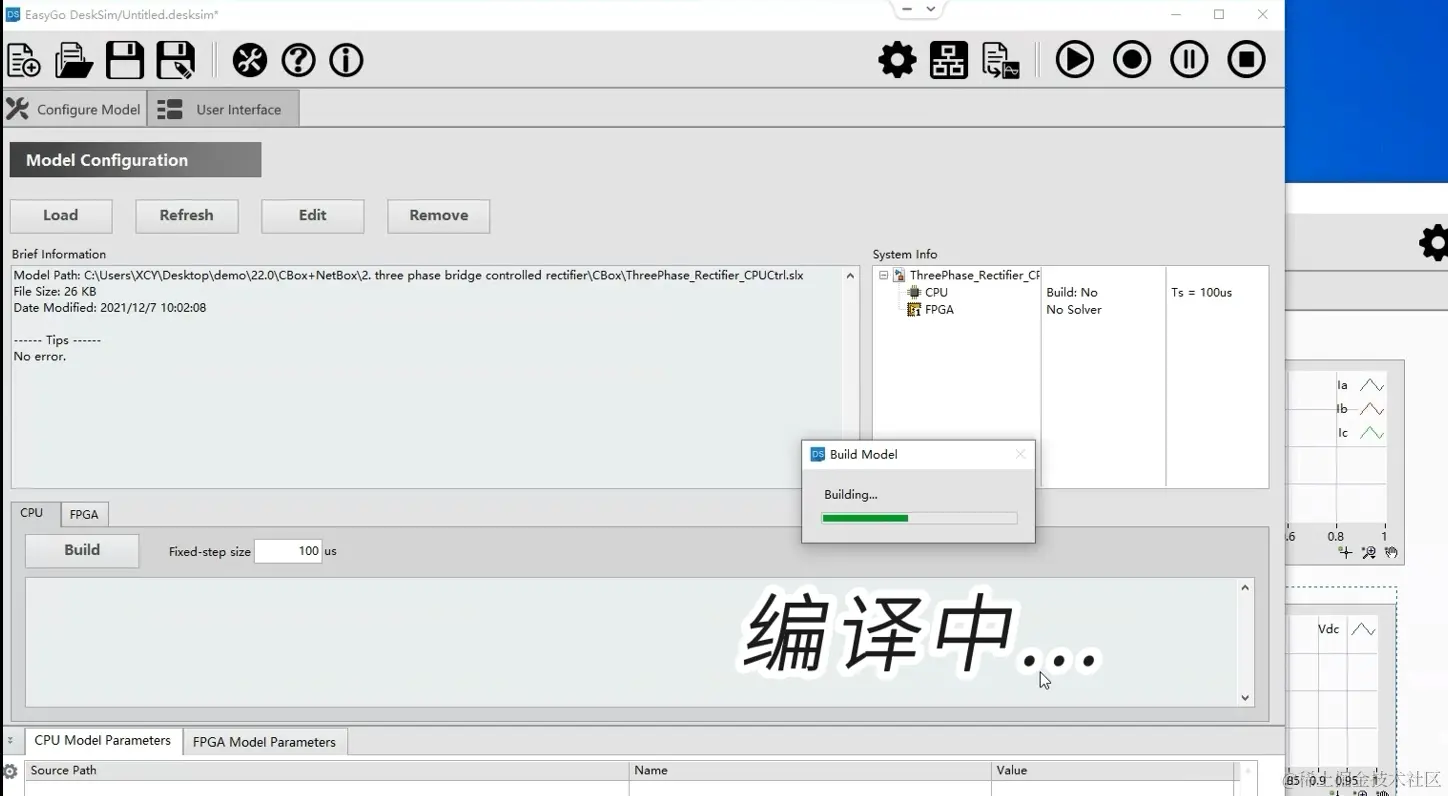 我们再打开一个desksim软件和控制测的程序,这是三相整流电路对应的控制算法程序。