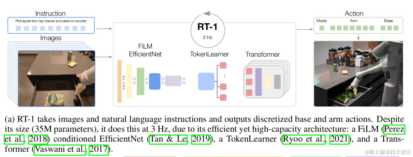研究者们提出了一个名为RT-1的Transformer架构,该模型通过开放式任务无关训练和高容量架构来吸收多样化的机器人数据。RT-1模型结合了FiLM(Feature-wise Linear Modulation)调节的EfficientNet、TokenLearner以及Transformer,以实现高效的推理速度和实时控制的可行性。 RT-1 的输入由图片序列、自然语言指令构成,输出由机械臂运动的目标位姿( x, y, z, roll, pitch, yaw)、gripper stαtus 、模式转换指令构成。