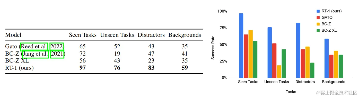 - RT-1在处理干扰物和背景变化方面表现出色,成功率分别达到83%和59%。