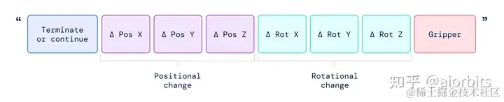 - RT-系列训练中使用的动作字符串表示。这样一个字符串的例子可以是一系列机器人动作令牌号码,例如“1 128 91 241 5 101 127 217”,其中每个数字代表一个特定的动作区间(旋转、位置变化)。