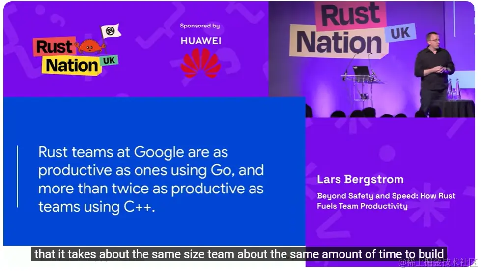 众所周知,Go 代码是内存安全但性能不及 Rust,所以 Google 进行了一系列的实践, Bergstrom 表示,Google 在将 Go 代码重写成 Rust 代码的实践中呈现出了一些优势,比如采用 Go 和 Rust 构建系统所消耗的人力和时间是差不多的,从 Go 转向 Rust 并不会降低开发效率。