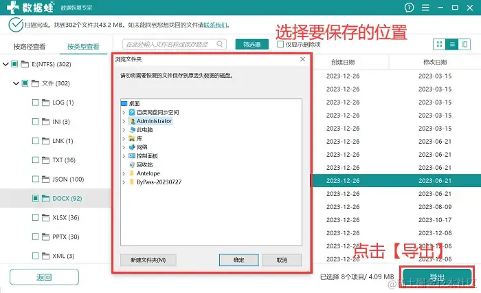 步骤4:将文件都勾选完毕后,单击【导出】,选择一个与原保存位置有所区别的位置作为文件恢复后的保存位置。