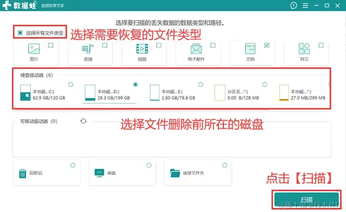 步骤2:确定好需要恢复的文件类型后将其勾选上(支持全选),并勾选上需要扫描的磁盘,单击选择 【扫描】 ;