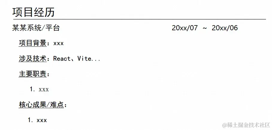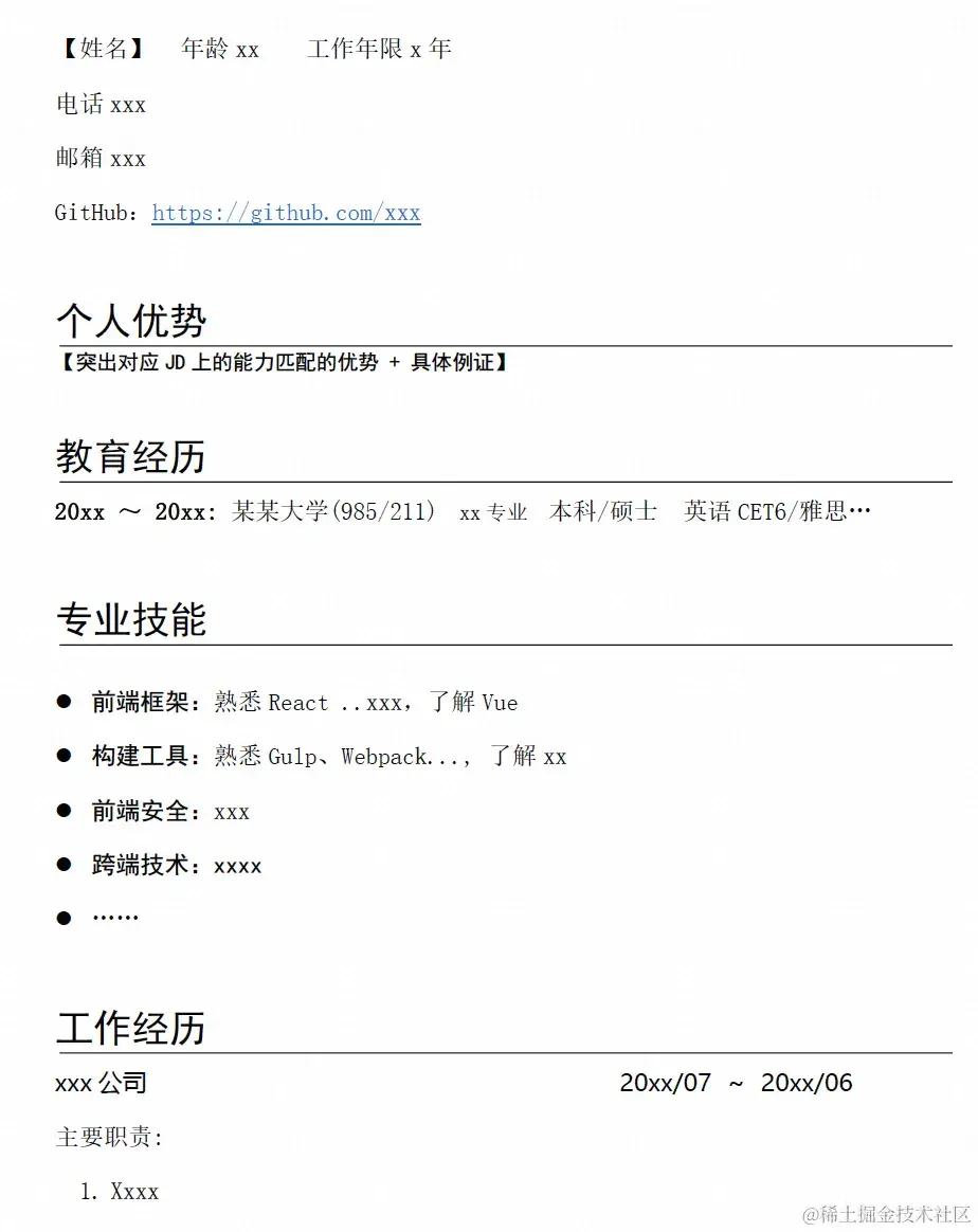 - 工作经历:主要阐述工作职责即可,概括下工作职责不是罗列项目,职责与项目还不是一个维度的,一个同学在公司可能会干很多的项目,这里也不用写做了啥多么难的事情,这部分可以放到项目经历,重点阐述清楚在公司负责的工作内容即可