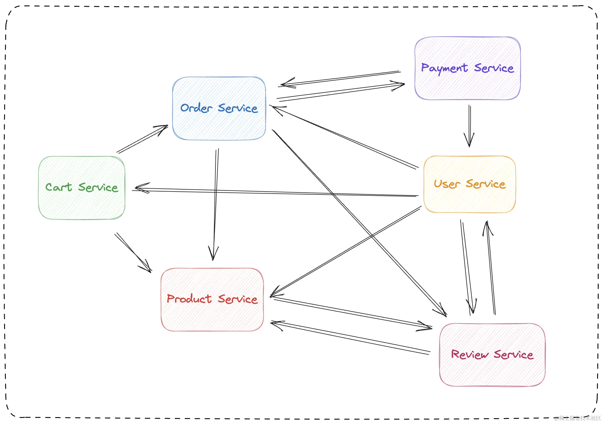 依旧是那个那个购物商场系统,随着业务演进,它的微服务依赖关系变成了这样: