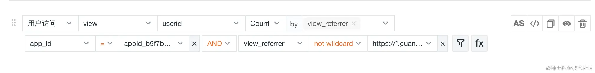 R::`view`:(count(`userid`)) { `app_id` = '***' and `view_referrer` != wildcard('https://*.com*') } BY `view_referrer`
