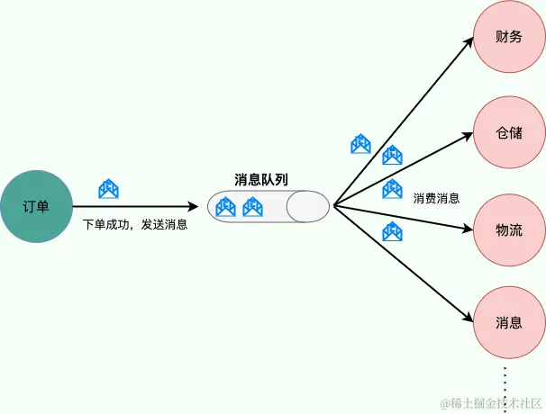 例如,我们商城系统分为用户、订单、财务、仓储、消息通知、物流、风控等多个服务。用户在完成下单后,需要调用财务(扣款)、仓储(库存管理)、物流(发货)、消息通知(通知用户发货)、风控(风险评估)等服务。使用消息队列后,下单操作和后续的扣款、发货、通知等操作就解耦了,下单完成发送一个消息到消息队列,需要用到的地方去订阅这个消息进行消息即可。
