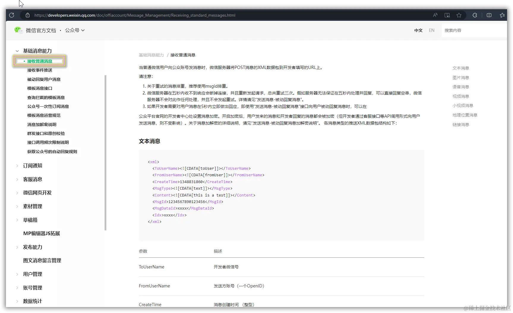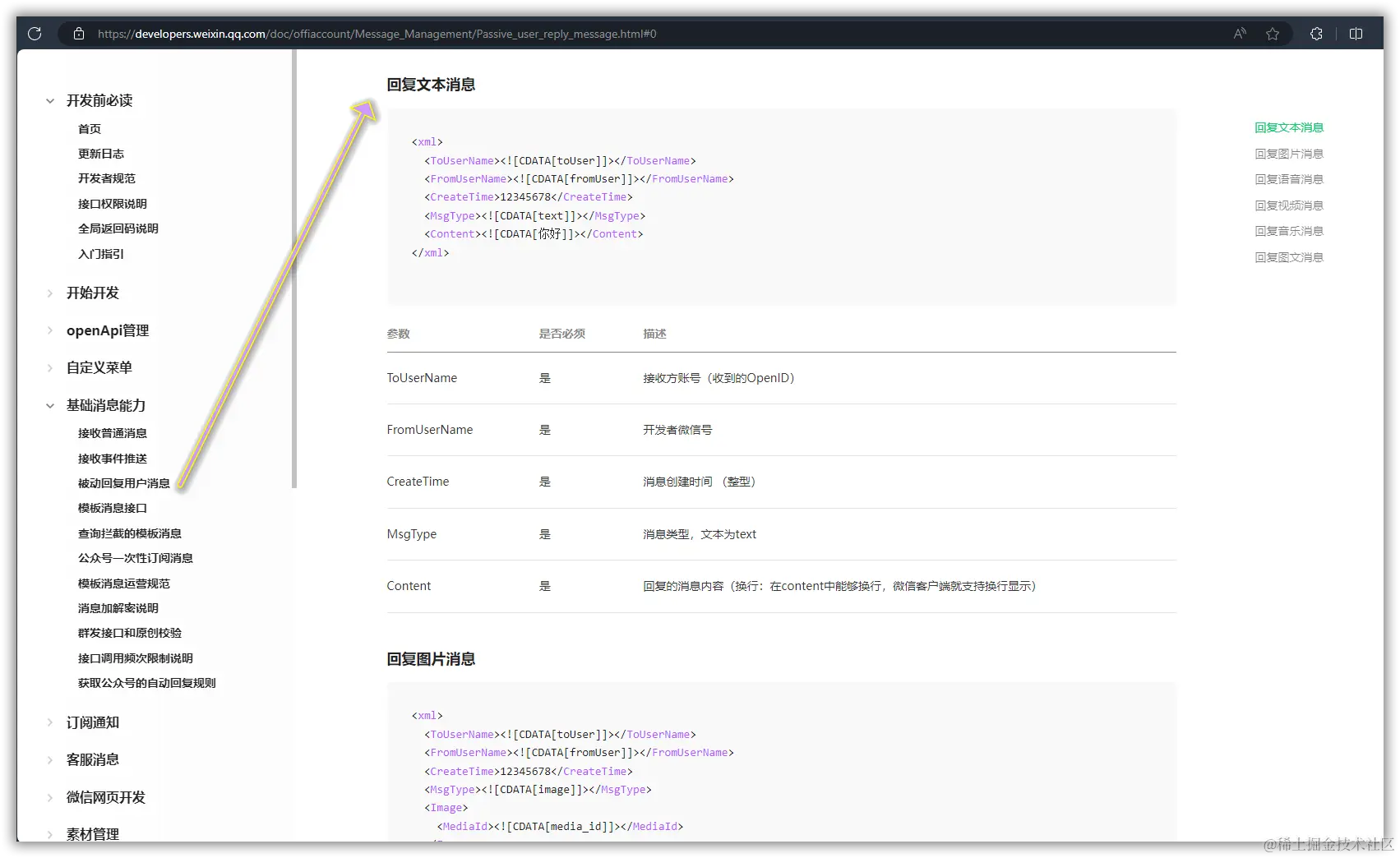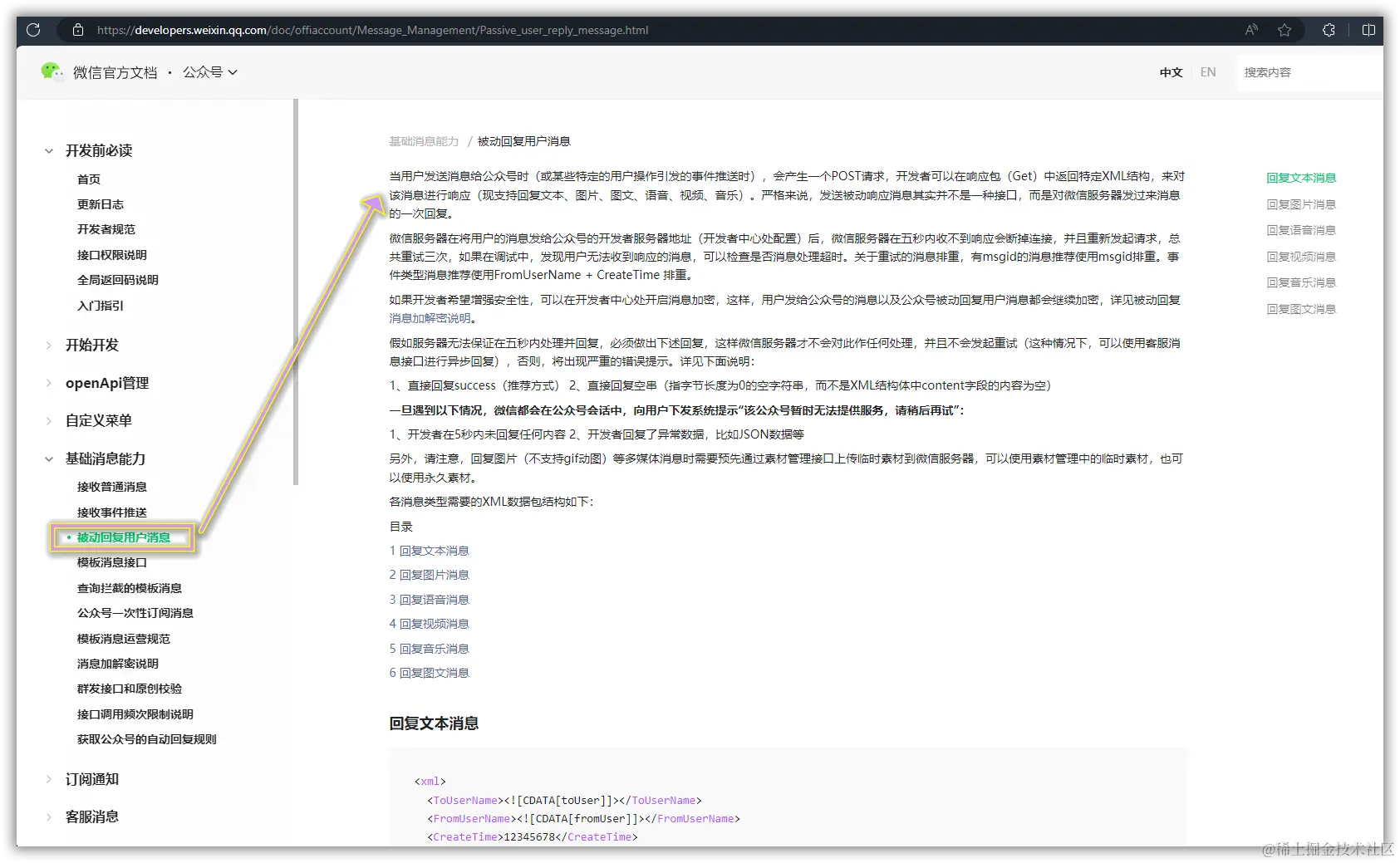 然后在微信公众号提供的微信官方文档中,找到【被动回复用户消息】章节,我们也是利用这个功能来实现想要的效果。