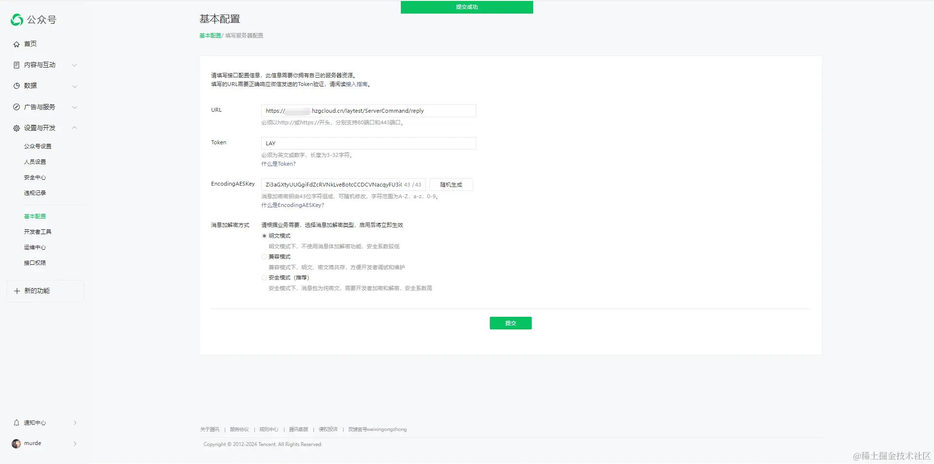 - 消息加密方式:这里选择明文模式