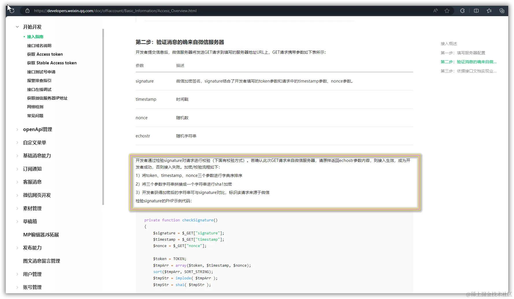 在正式调用被动回复用户消息接口之前,我们需要先在微信处填写服务器配置,这里可以参考微信官方文档的接入指南。在文档中可以看到我们需要在后台中填写一个WEB-API的请求路径,这个API需要接收来自微信服务器的一个GET请求,然后原样返回这个请求的echostr参数,即可完成接入。