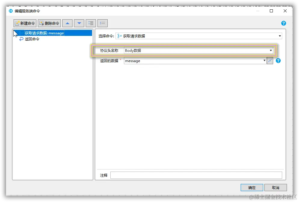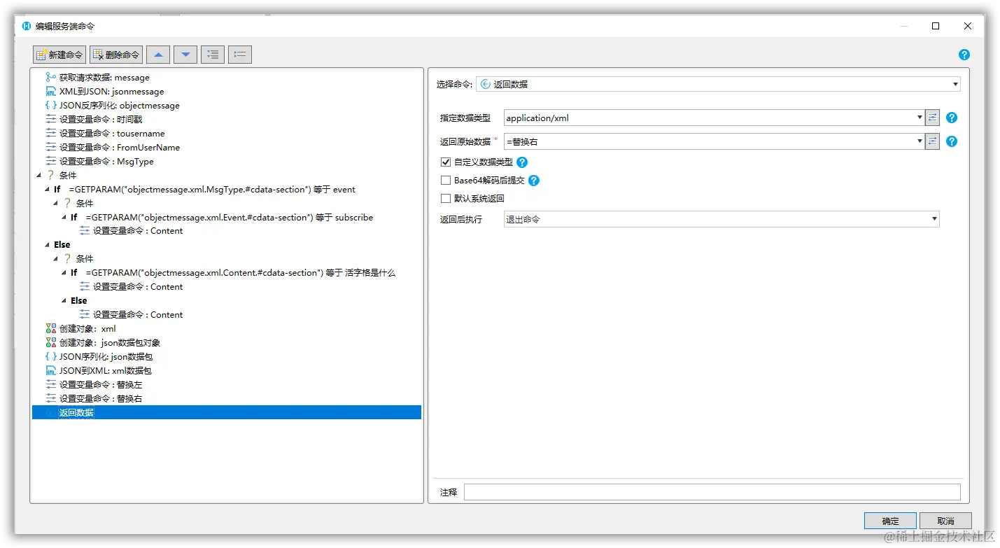 同样,我们在活字格工程中新建一个服务端命令,使用【获取请求数据】命令,就可以获取到微信公众号推送的XML数据包。