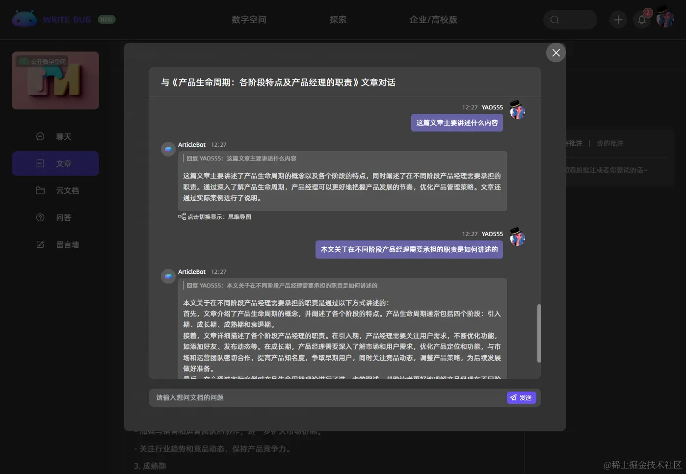 再者,WriteBug 数字空间的AI Bot的知识提炼功能更使得海量信息的筛选与整合变得轻而易举。面对庞杂的专业性内容,WriteBug 数字空间的AI大模型可以迅速抓取关键知识点,提炼核心思想,形成系统化的知识脉络。无论是我们想要深入研究某一专业领域,还是快速了解跨学科知识,它都可以帮助我们在短时间内获取精华的部分,提高我们学习与研究的效率,使得知识的汲取更为精准且高效。