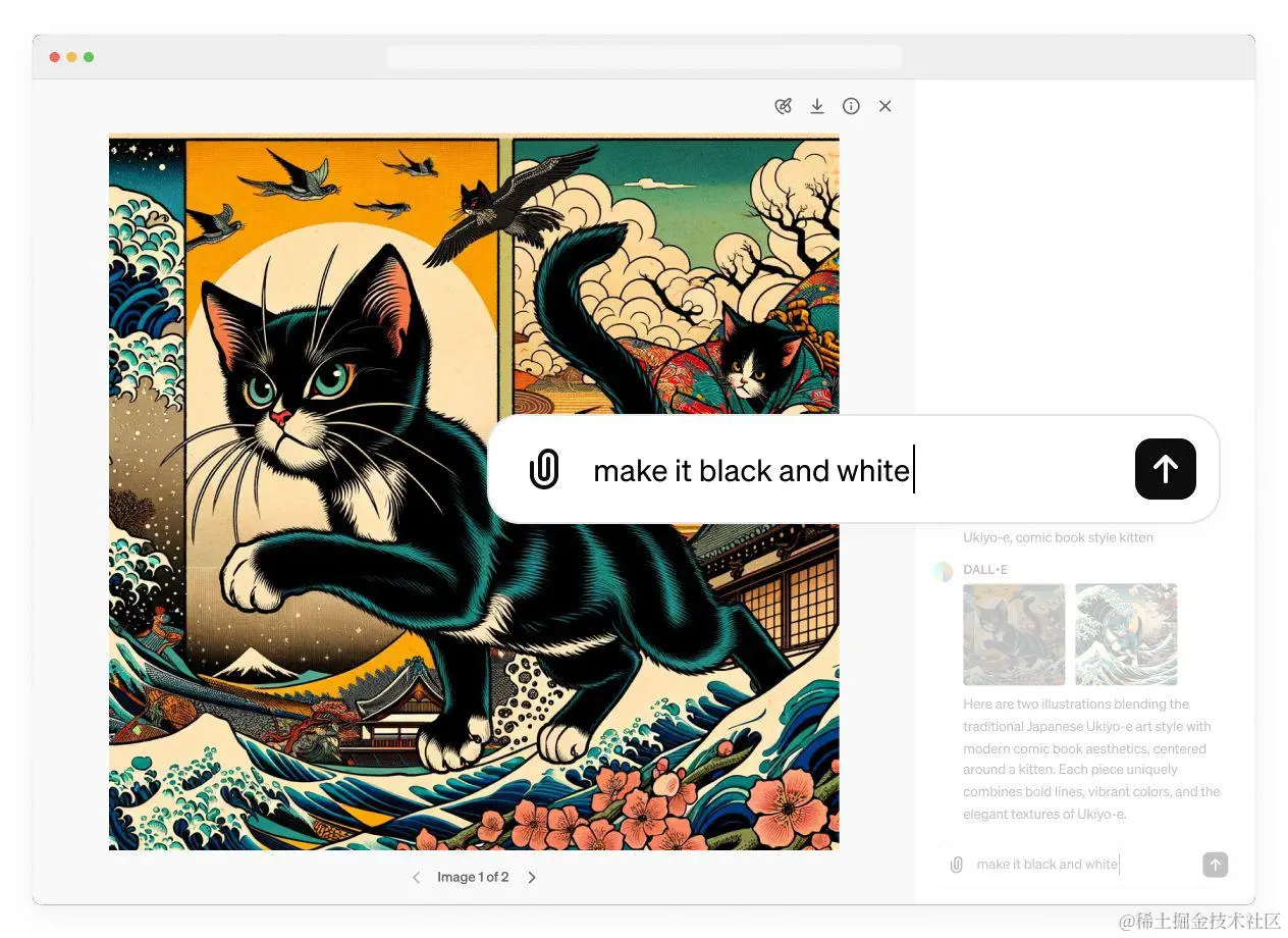 在 DALL-E 3 生成图片之后,用户无需选择特定区域,在聊天窗口中直接描述自己的编辑内容,这种方法适用于编辑调整整个图像。
