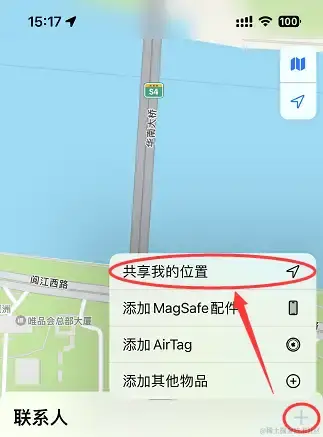 Step 3:苹果手机怎么共享对方手机位置?如果你想要和别人共享位置,可以点击**【+】按钮。再点击【共享我的位置】**,然后选择想要共享位置的联系人进行分享。