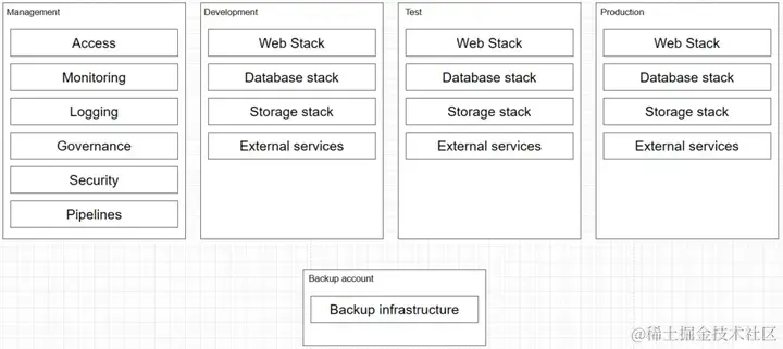 管理账户将运行基础架构运转所需的所有“操作”服务,如监控、构建和部署管道、安全工具、安全访问服务等,我们将为开发/测试和生产工作负载提供专门的开发、测试和生产账户。这样做的目标是使开发、测试和生产账户在规模以外的各方面都完全相同。这将确保运行的所有基础架构和应用测试都能提供真实的结果。