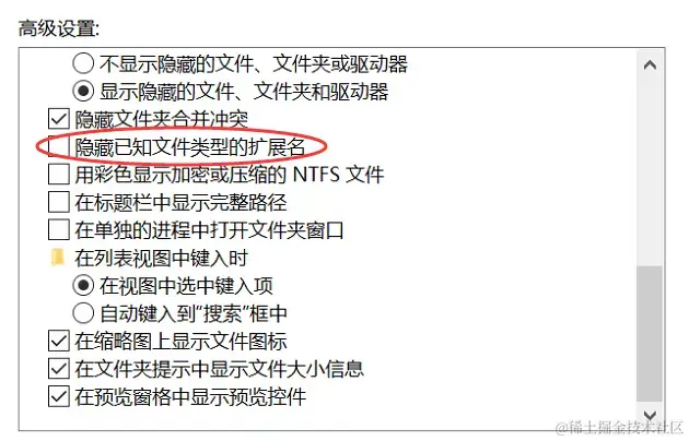 (4)在【高级设置】列表中,找到 【隐藏已知文件类型的扩展名】选项,并取消其勾选状态,点击【确定】按钮保存更改。
