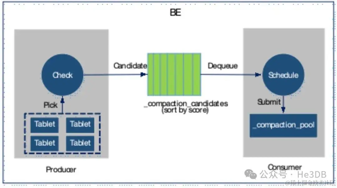 首先,Compaction机制由即时创建工作线程转变为生产(Check)-消费(Schedule)模型。这种机制在Compaction频率不高的场景下,剔除了那些闲置的工作线程,节约了资源。其次,挑选rowset进行Compaction的策略也升级了。因此,本文以新架构为基准进行介绍。