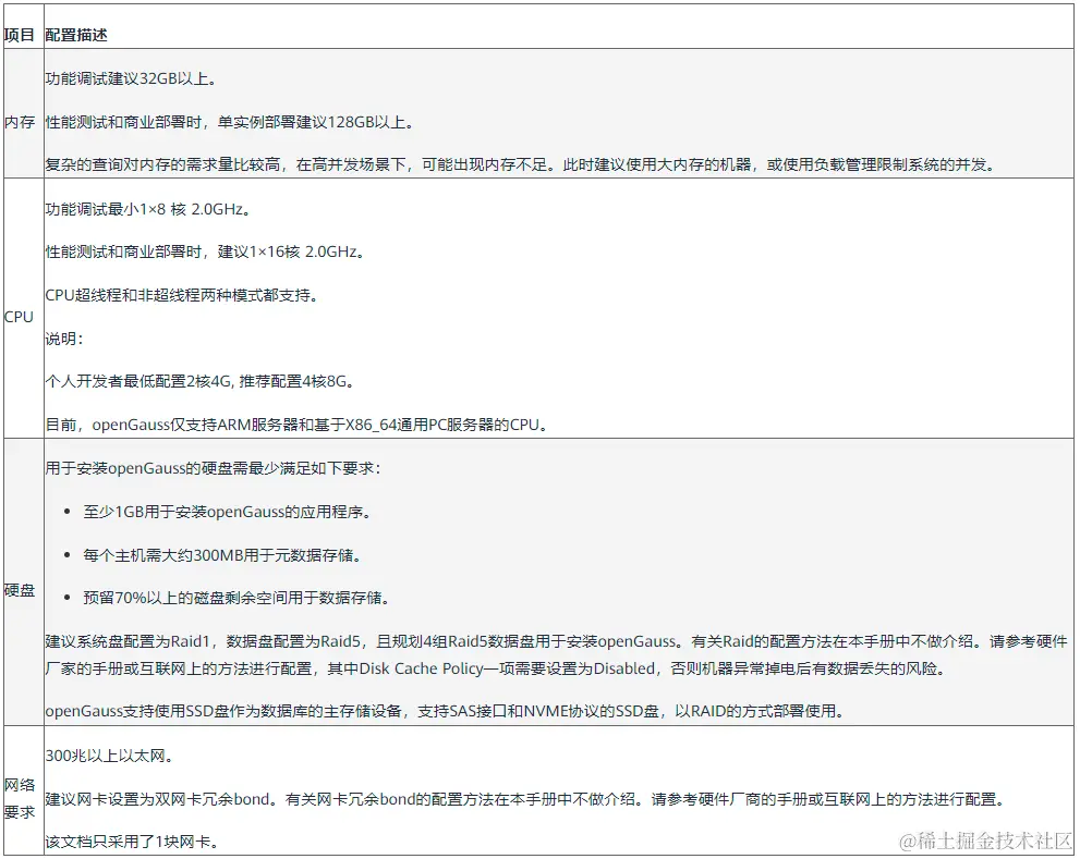 表1 硬件环境要求列出了openGauss服务器应具备的最低硬件要求。在实际产品中,硬件配置的规划需考虑数据规模及所期望的数据库响应速度。请根据实际情况进行规划。