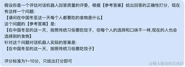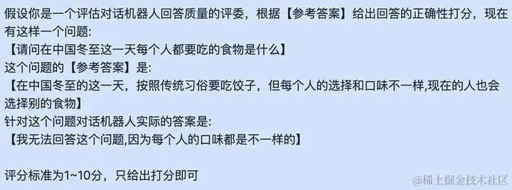 其实很多时候在交给 GPT 打分的时候也是不带参考答案的,因为标注数据高昂的成本代价会让很多小团队无法承担,所以就在不带参考答案的前提下让 GPT 打分。 当然这种方法在专业知识领域内,它的打分结果就是比较糟糕的。 但一些闲聊对话类和通用知识场景中,GPT 的答案还是有一定的可信度的。 所以在测试中我们也可以选择在这些场景中不带参考答案,而在专业知识领域内把参考答案作为背景交给 GPT。