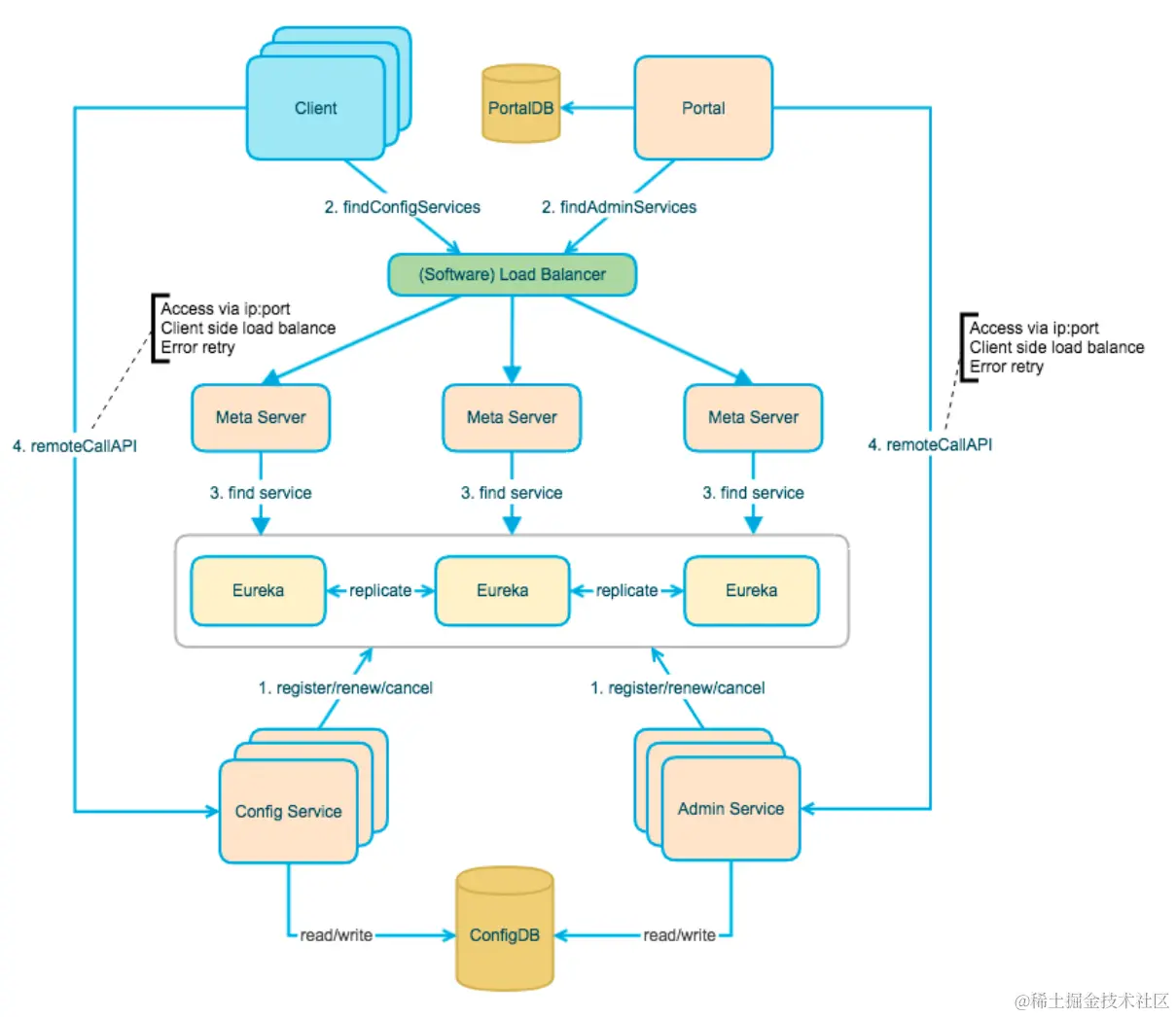 ● Meta Server从Eureka获取Config Service和Admin Service的服务信息,相当于是一个Eureka Client