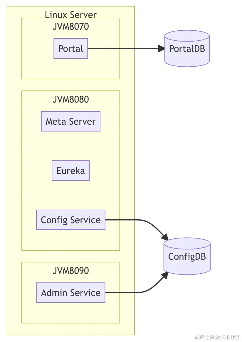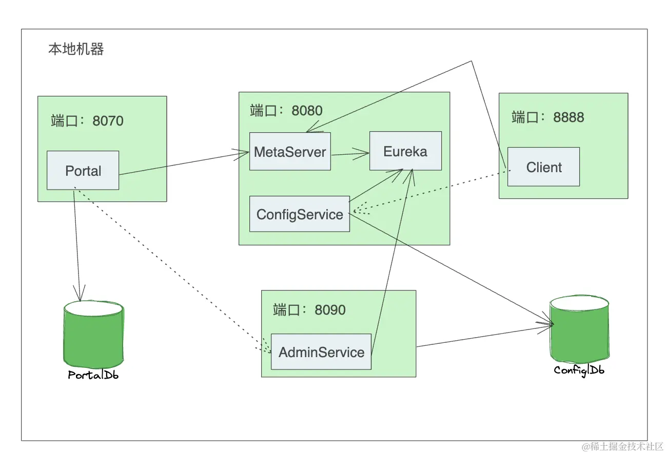 ● Meta Server只是一个逻辑角色,在部署时和Config Service是在一个JVM进程中的,所以IP、端口和Config Service一致