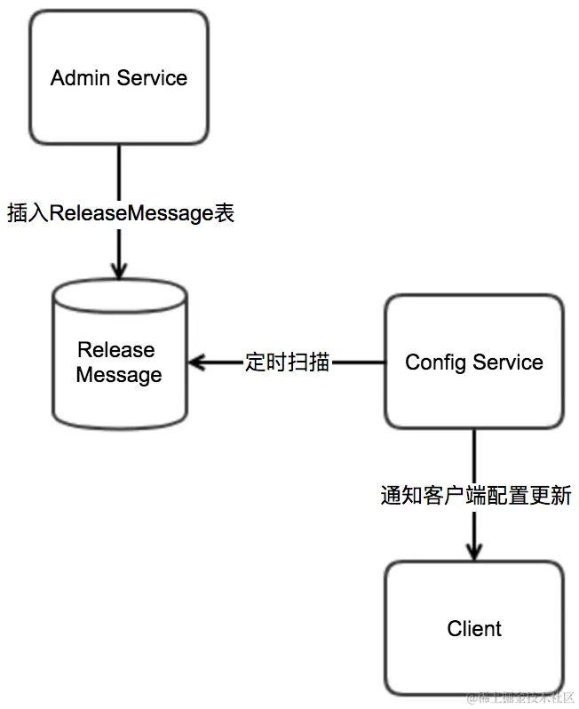 1、Admin Service在配置发布后会往ReleaseMessage表插入一条消息记录,消息内容就是配置发布的AppId+Cluster+Namespace,参见DatabaseMessageSender