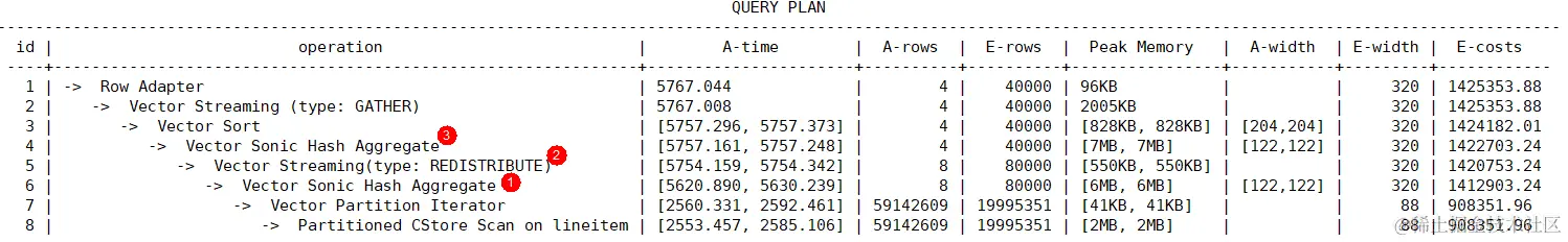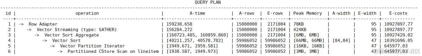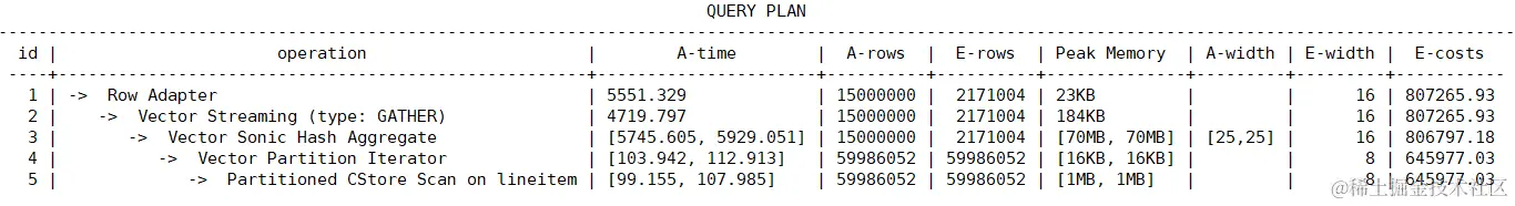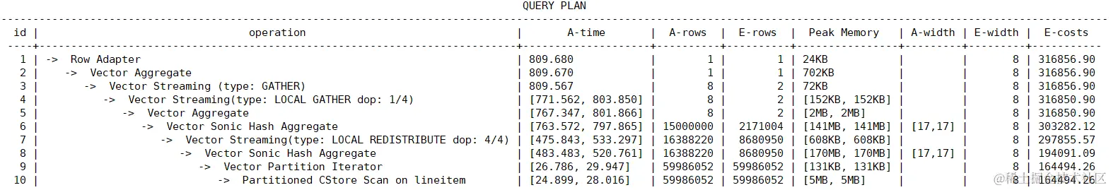 从上述计划可以看出,向量化引擎相比行执行引擎,执行性能有数倍的提升效果。