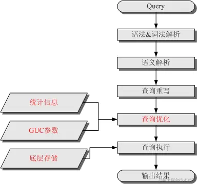 在GaussDB(DWS)中,SQL语句的执行所需要经历的步骤如下图所示,其中红色部分为DBA可以介入实施调优的环节。