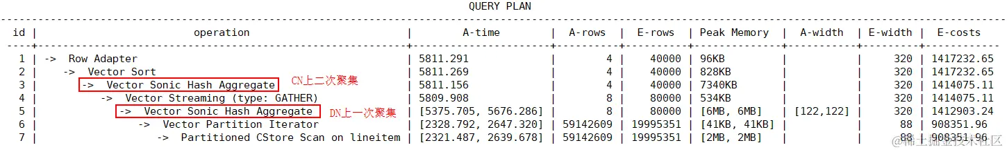 当best_agg_plan=1时,在DN上进行了一次聚集,然后结果通过GATHER算子汇总到CN上进行了二次聚集,对应的查询计划如下: