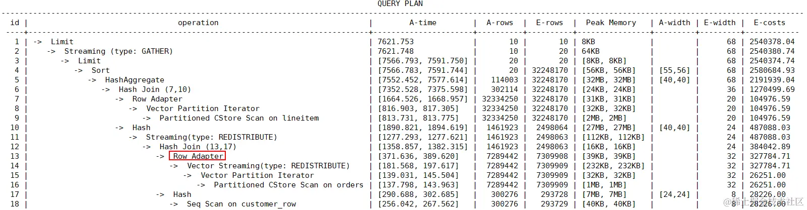 SQL语句中的customer_row表为行存表,orders和lineitem为列存表,该场景在默认参数的情况下无法走向量化引擎,Row Adapter算子表示将列存数据转为行存数据,对应的查询计划为: