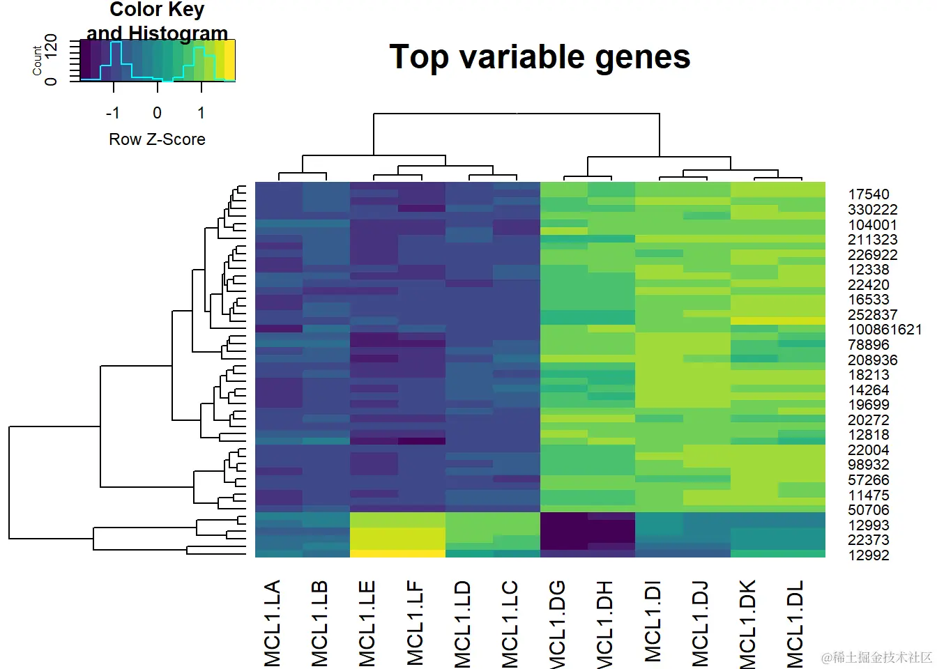与其对所有15000+个基因进行聚类(这只会给分析增加噪音),我们不如对变化最大的500个基因进行聚类。这是一个任意的截止值,可以根据需要进行调整。