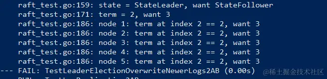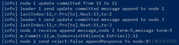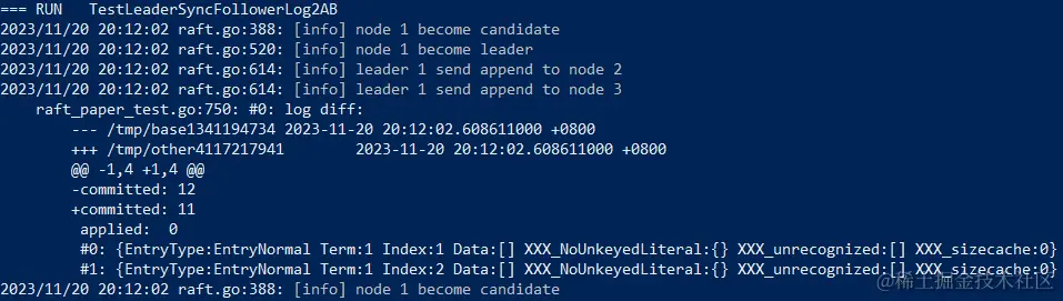 通过它打印出的 diff,我们可以看到就是 committed 不一样,根据打印出的信息,leader 的 committed 已经转化了,就是它同步 committed 的 append 消息没发出去,我们修改 sendAppend 函数,去掉 lastIndex 和 r.Prs[to].Next 之间比较的逻辑,他这个消息可以发出去