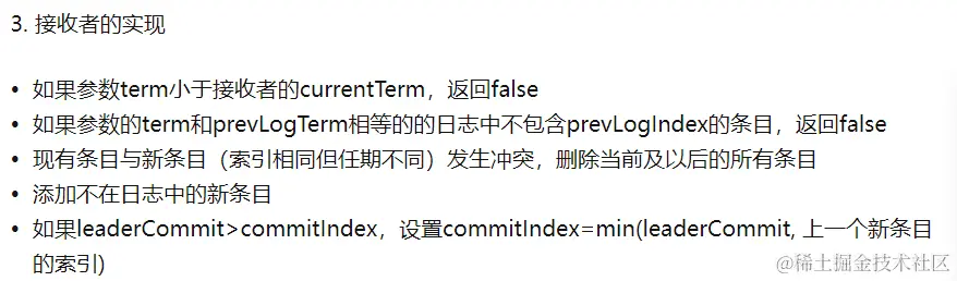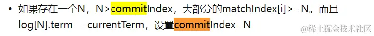 更新 commit,如果存在一个 N,N>commitIndex,大部分的 matchIndex[i]>=N,而且 log[N].term==currentTerm,则设置 commitIndex=N