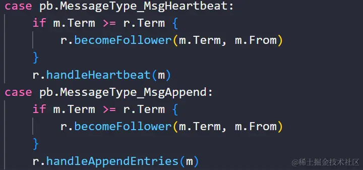接收到复制条目的消息后,他的处理和 MsgHeartBeat 相似,先判断 Term,如果相同就转化为 follower,接下来的处理方式和 follower 相同