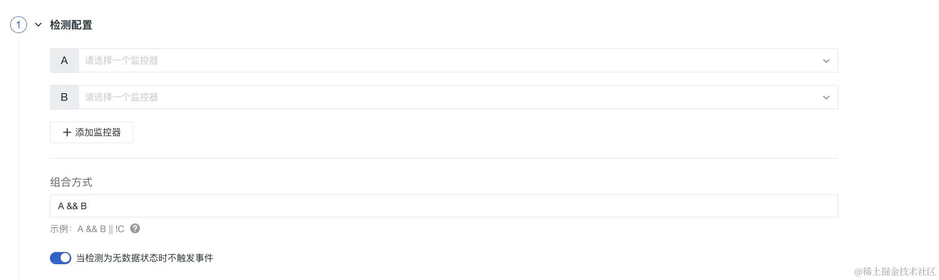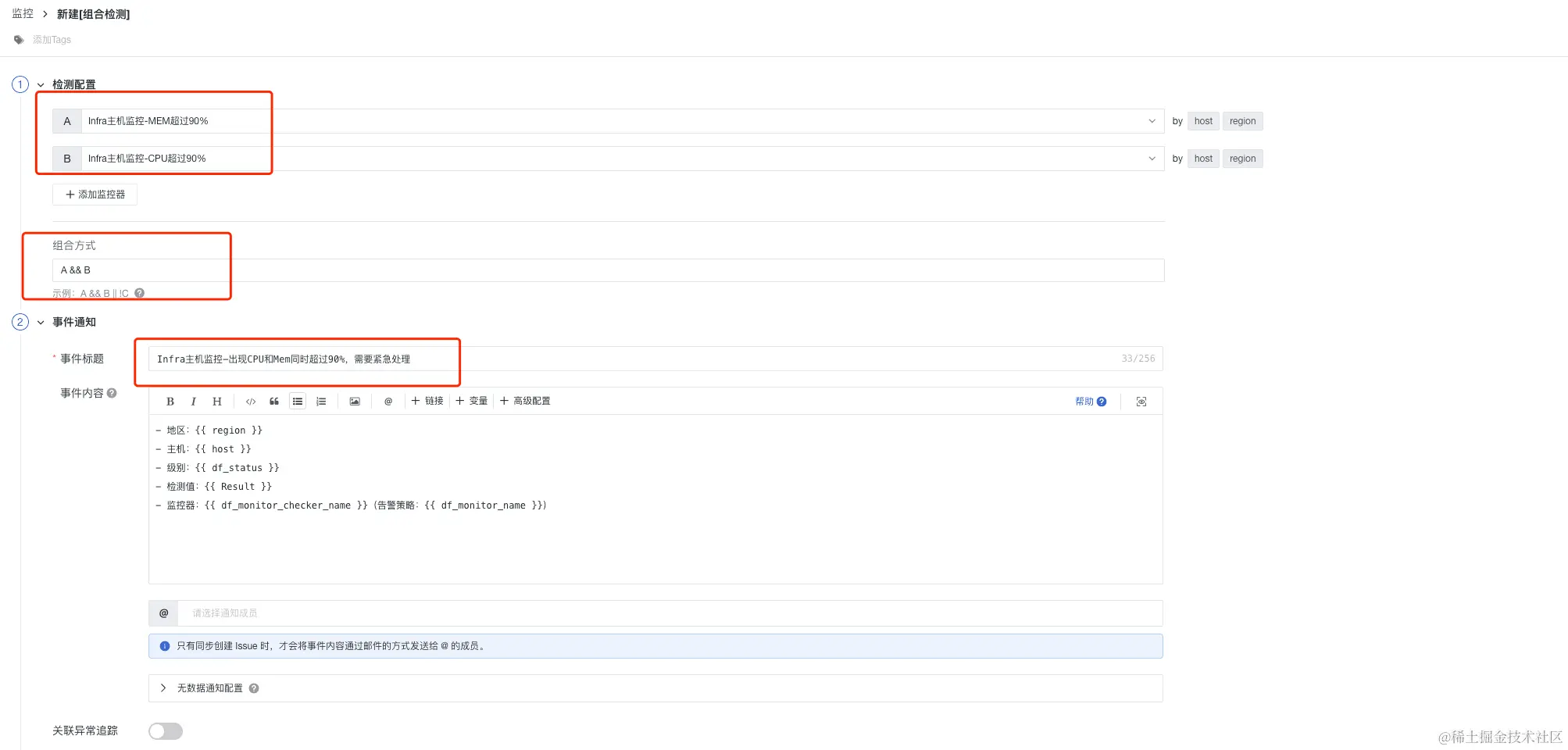 2)组合方式:遵循与或非的运算逻辑表达式来定义组合监控器是否触发事件。当所选监控器都触发异常状态时,解析为真,反之解析为假。