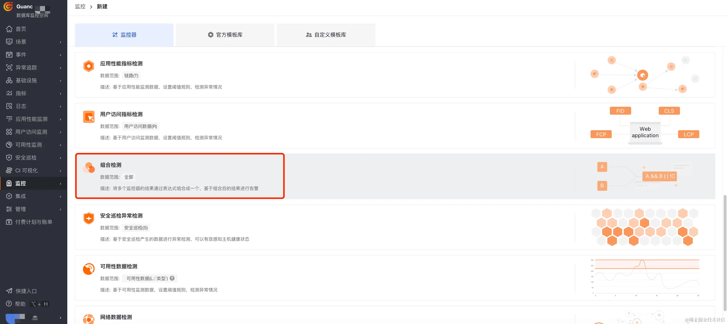 在控制台中点击监控器 > 新建监控器 > 组合检测,进入区间检测规则配置页面。
