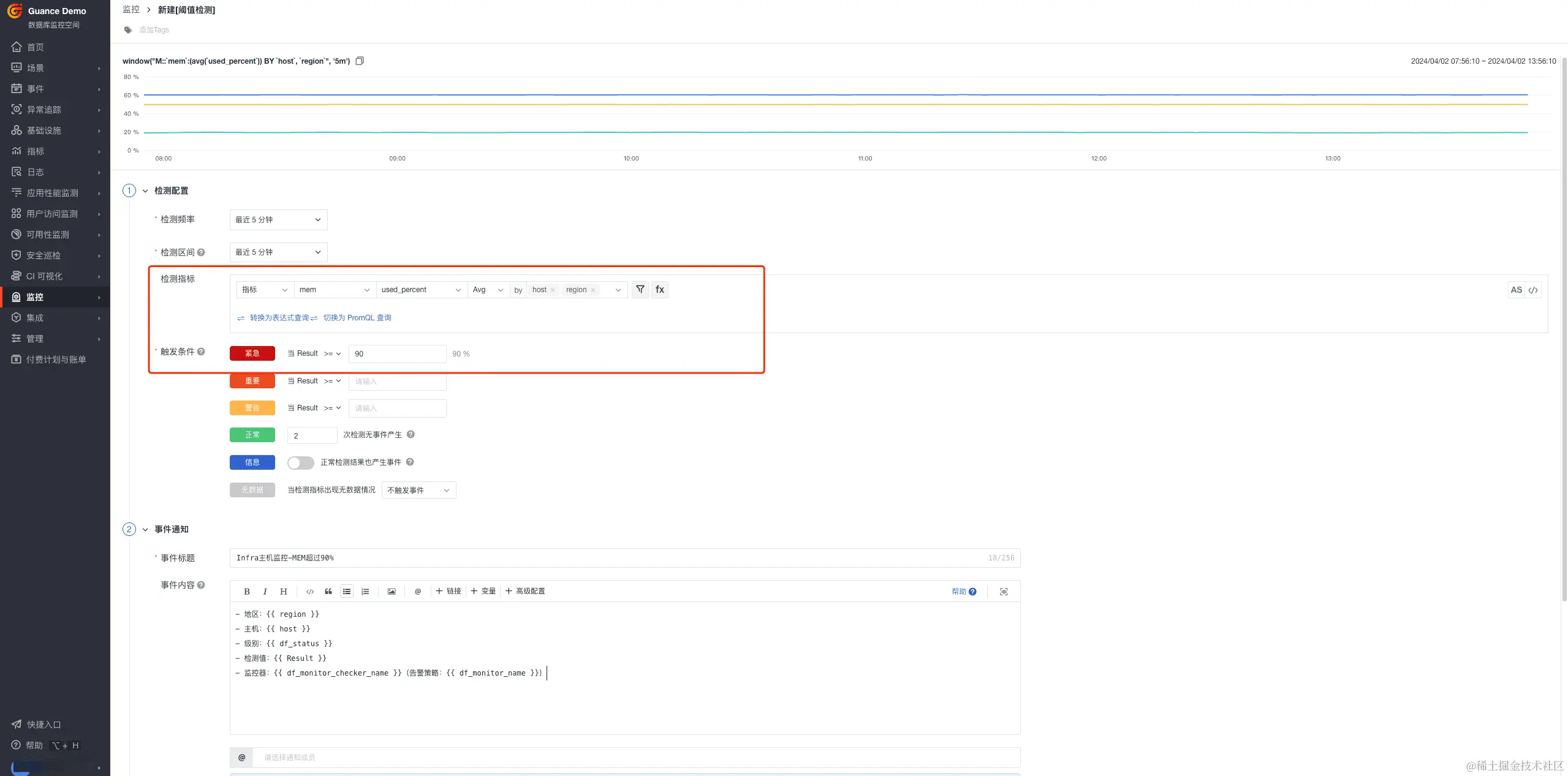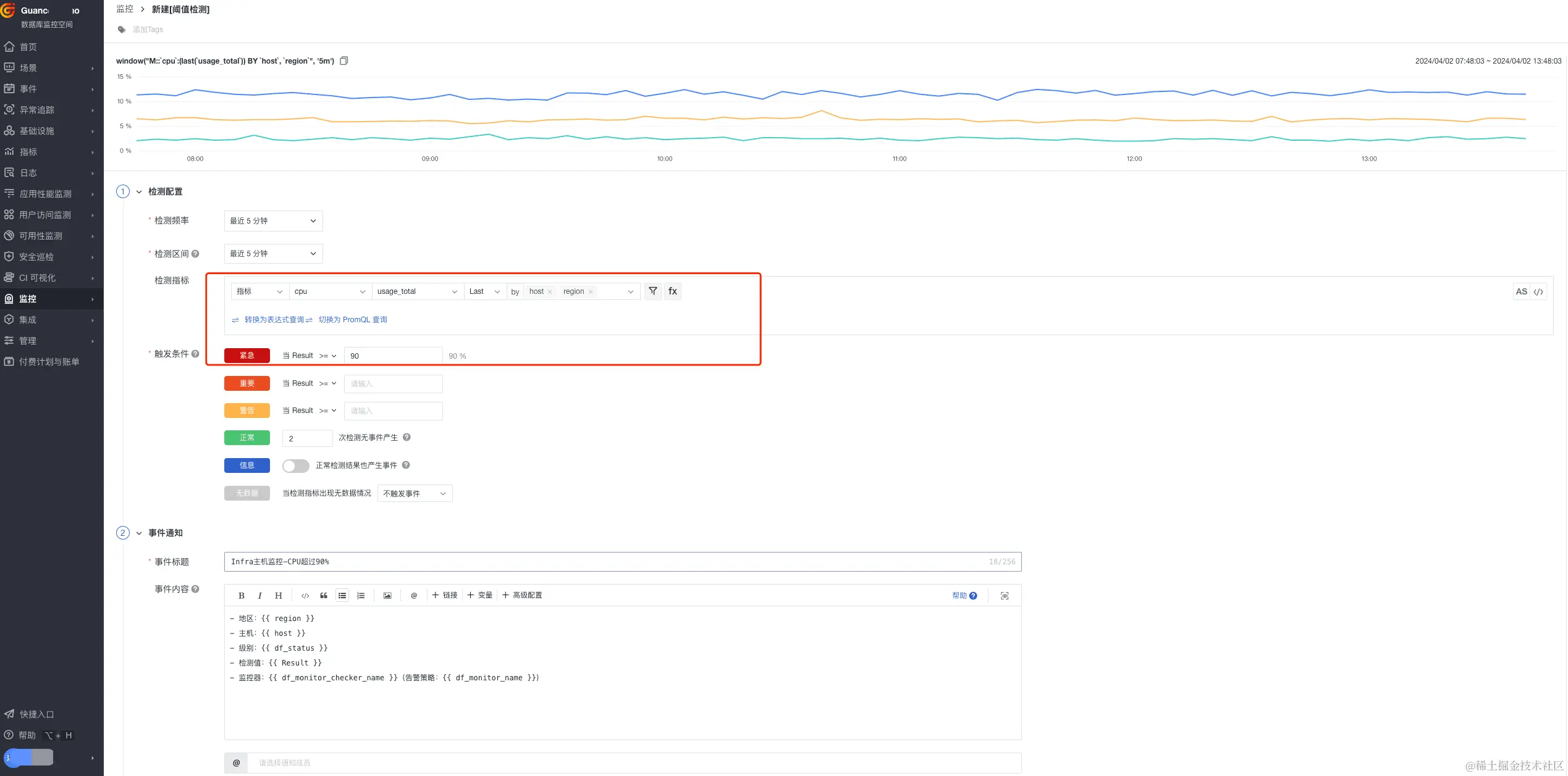 Infra 基础设施层指标组合监测中,SRE 工程师需要设置一些优先级最高的告警,比如当 CPU、MEM 同时满足 90% ,紧急通知一线人员,设置主要分以下几步骤: