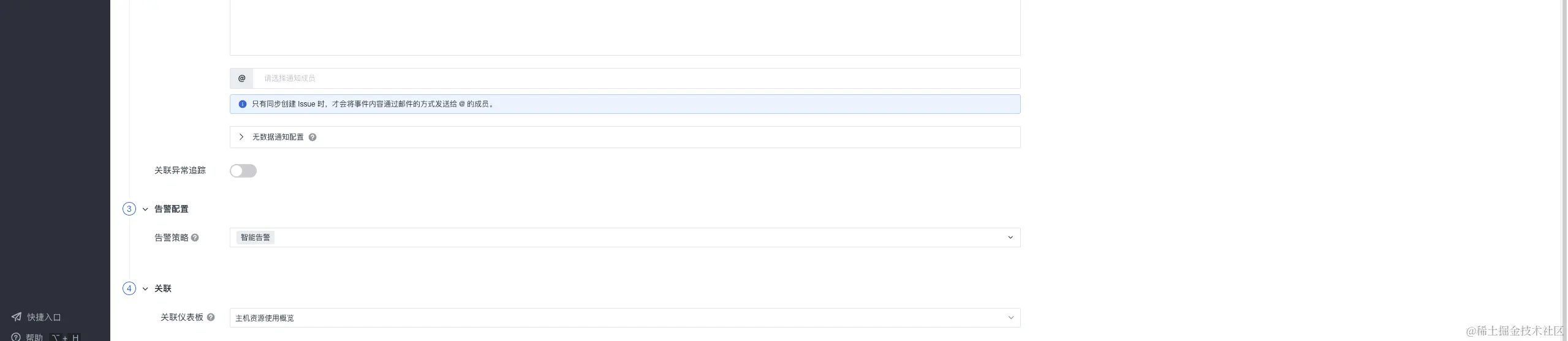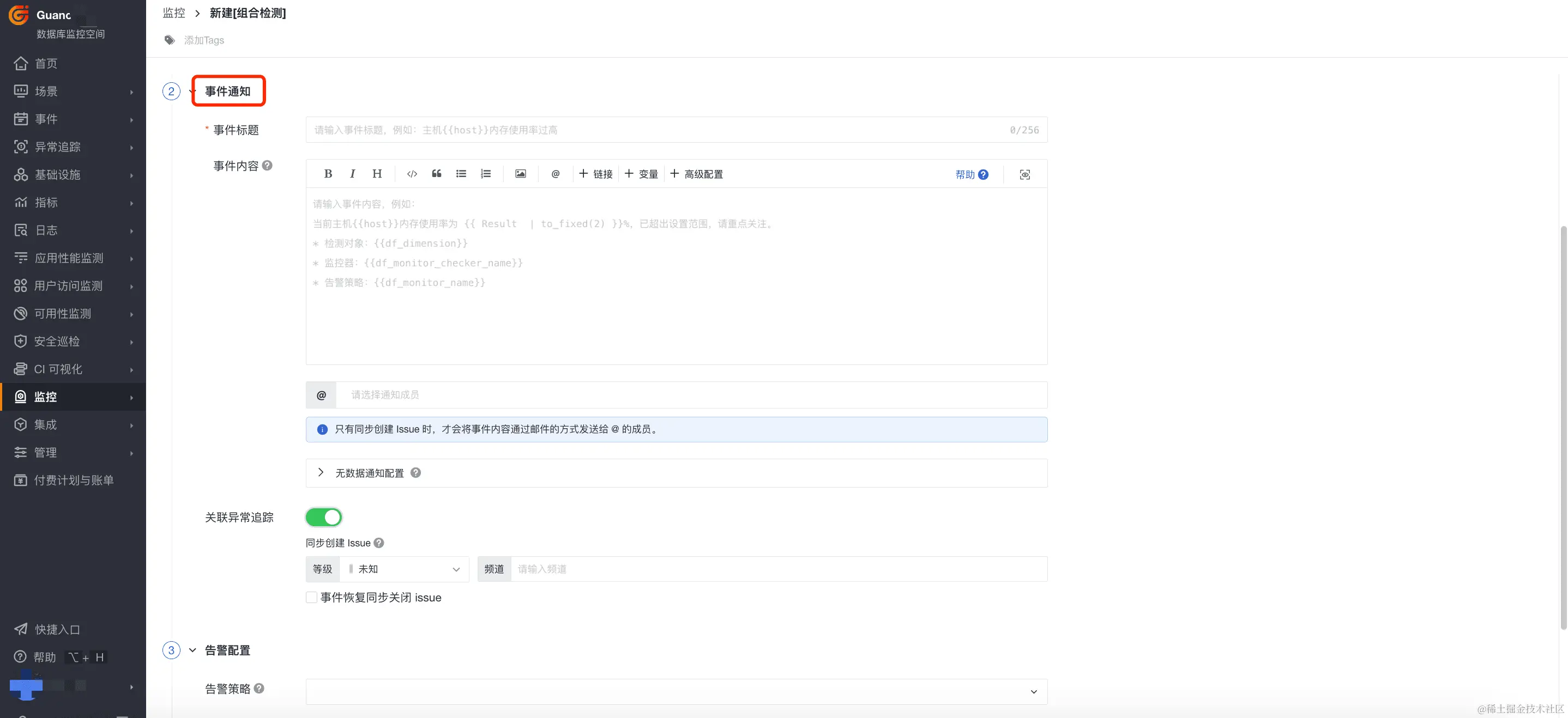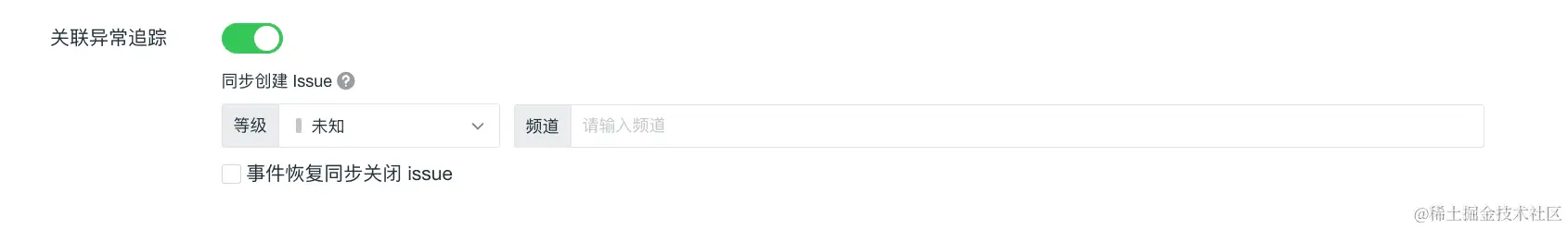3)关联异常追踪:开启关联后,若该监控器下产生了异常事件,将同步创建 Issue。选择 Issue 的等级以及需要投递的目标频道,产生的 Issue 可以前往异常追踪 您选定的频道进行查看。