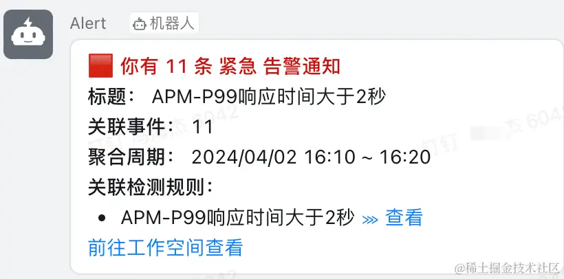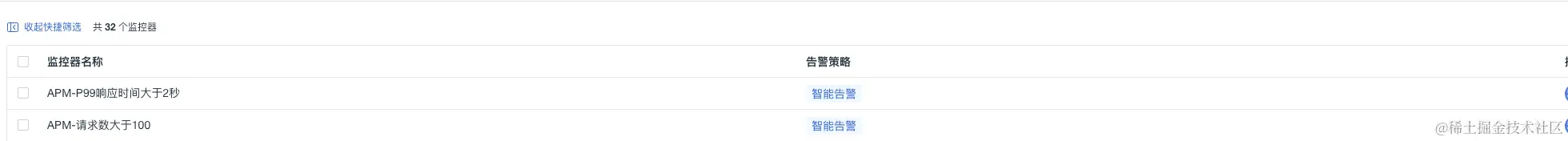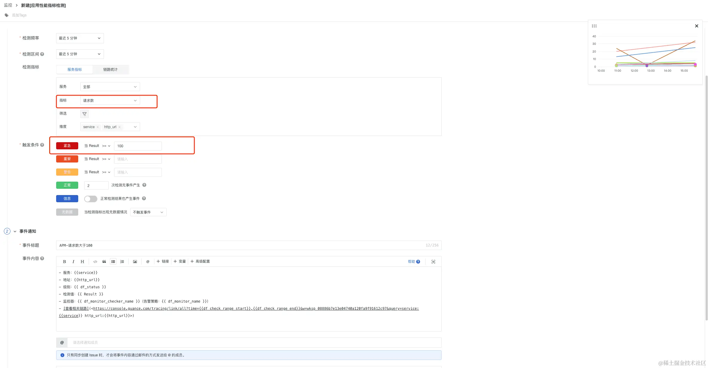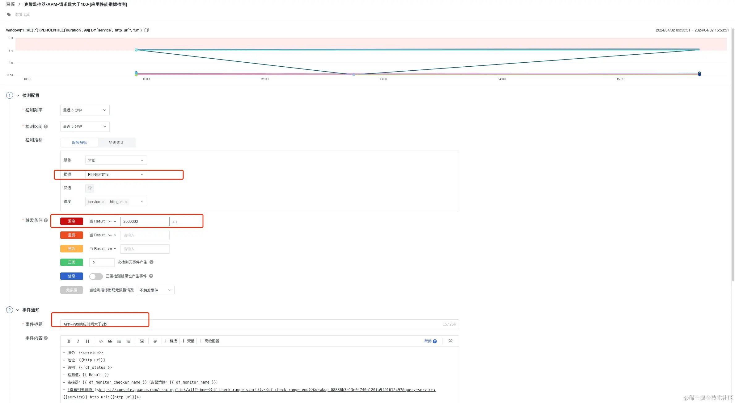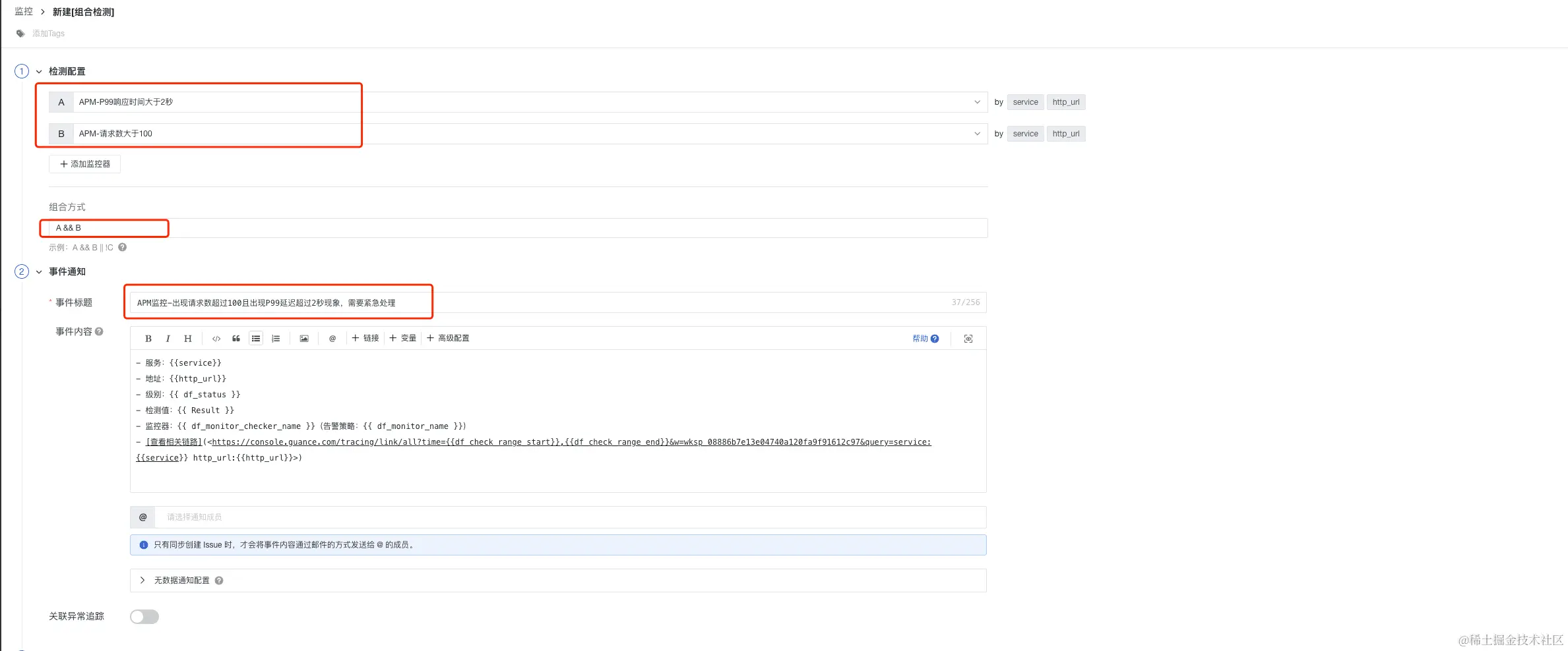 监控 APM 应用链路性能组合监测中,开发工程师也是需要设置一些优先级最高的告警,比如当监测链路请求的 P99 延迟,那么如果请求数比较少,直接配置告警,会出现误报现象,那么这个单个监控是没有价值的,所以组合监控方案中:将请求数和 P99 延迟进行组合,当请求量满足阈值(大于 100),而且 P99 延迟大于设定阈值,立刻告警,通知一线开发,告警升级,紧急修复,达到精准监控的效果,设置主要分以下几步骤: