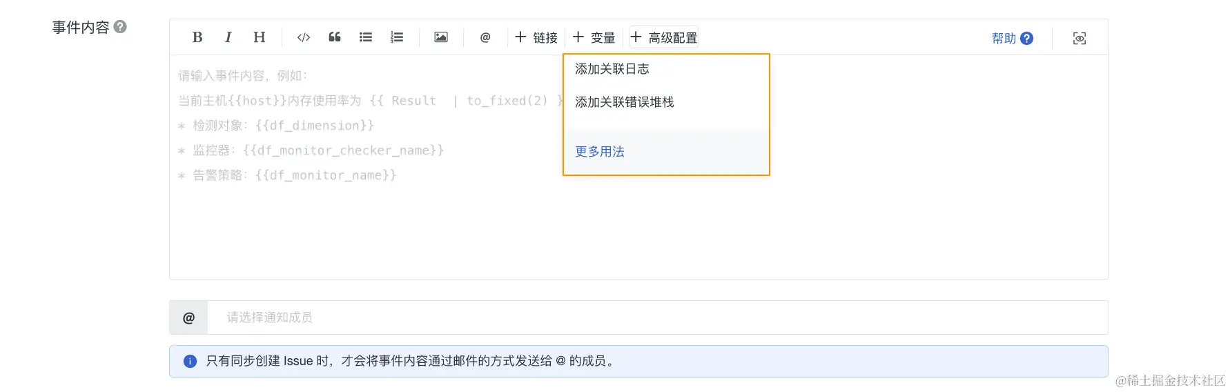 2)事件内容:满足触发条件时发送的事件通知内容。支持输入 Markdown 格式文本信息并预览效果,支持使用预置的关联链接,支持使用预置的模板变量。