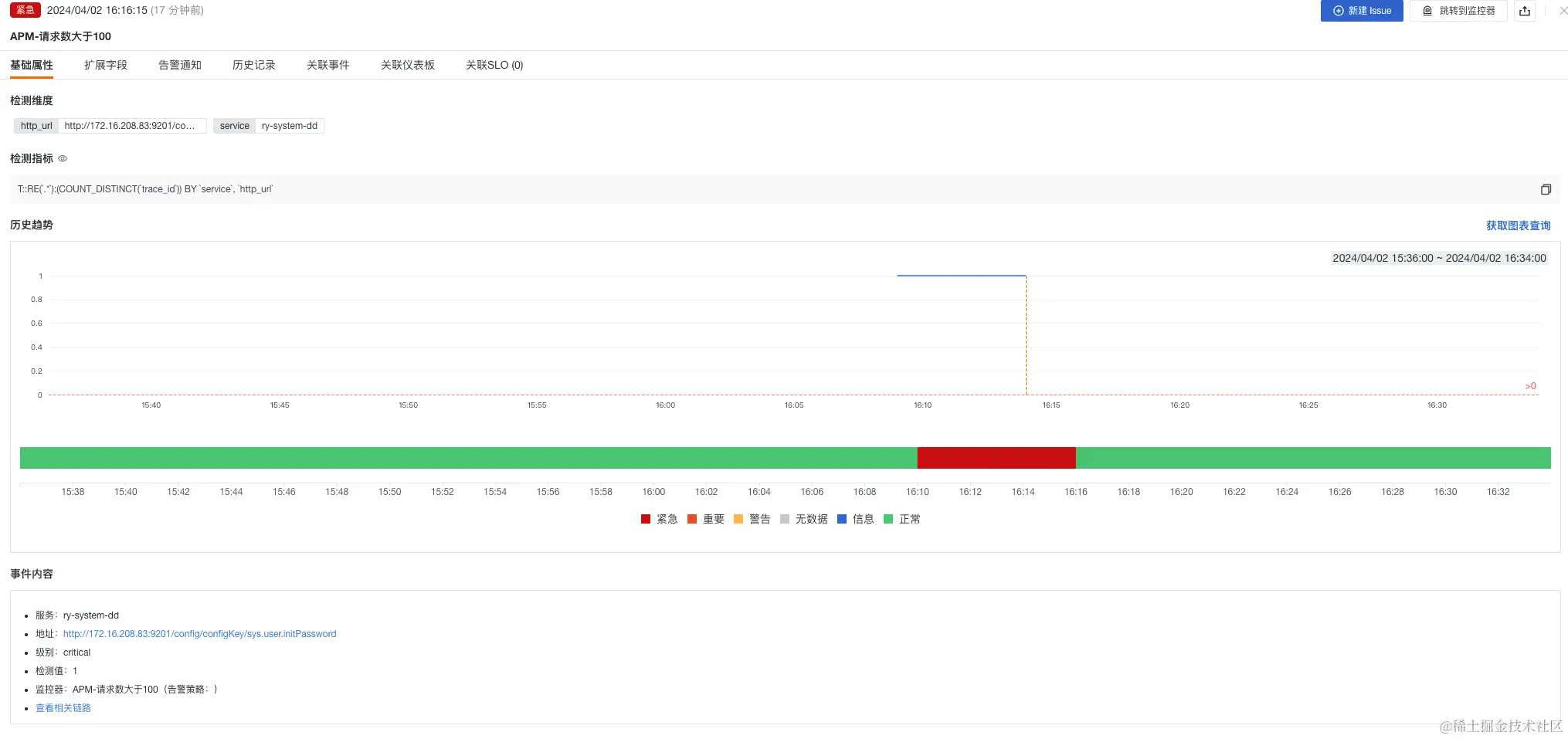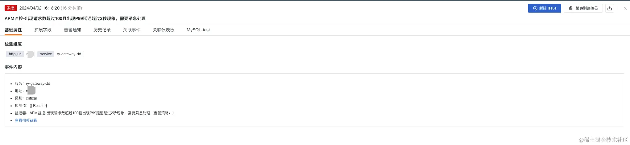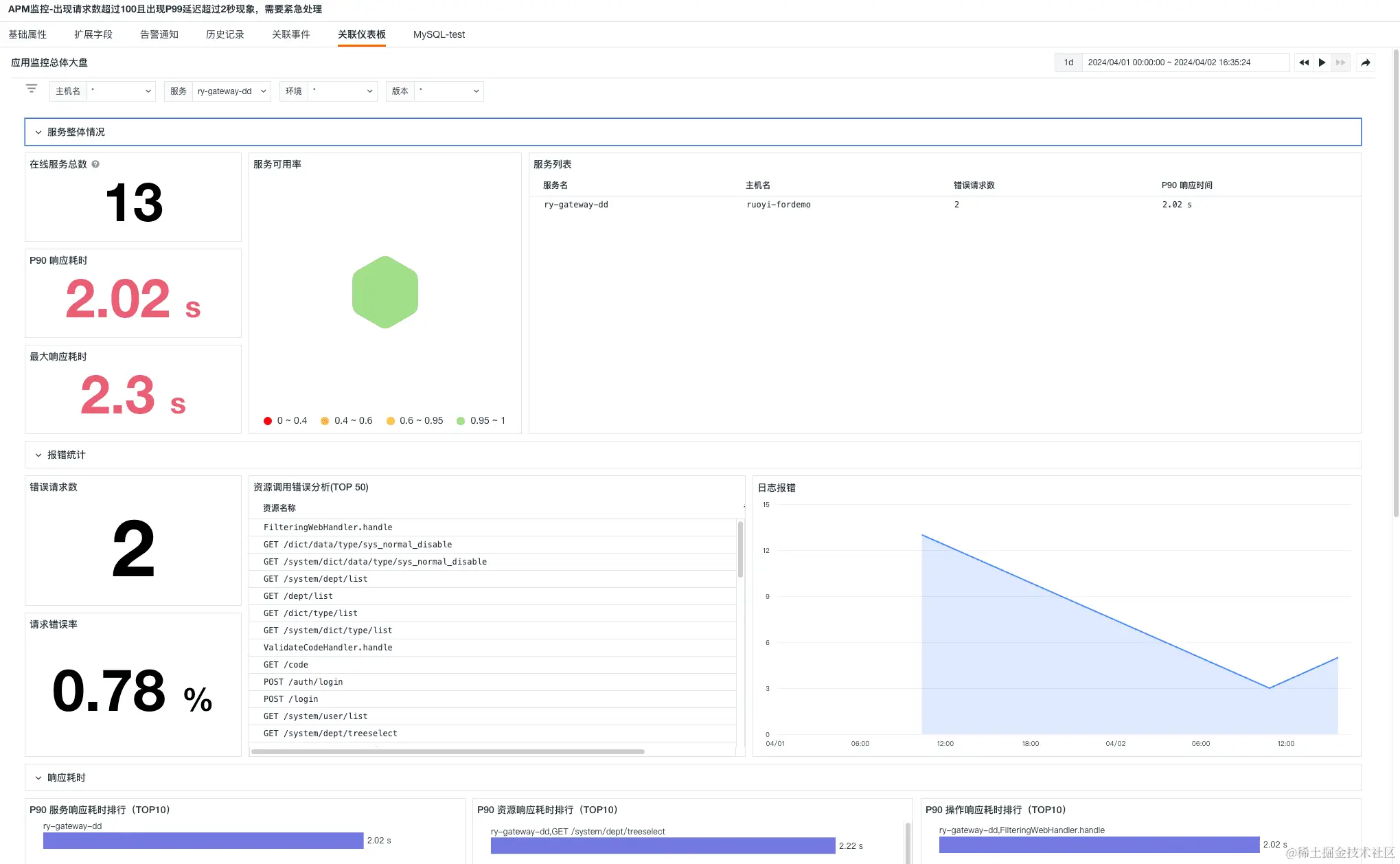 - APM 监控-出现请求数超过 100 且出现 P99 延迟超过 2 秒现象,需要紧急处理