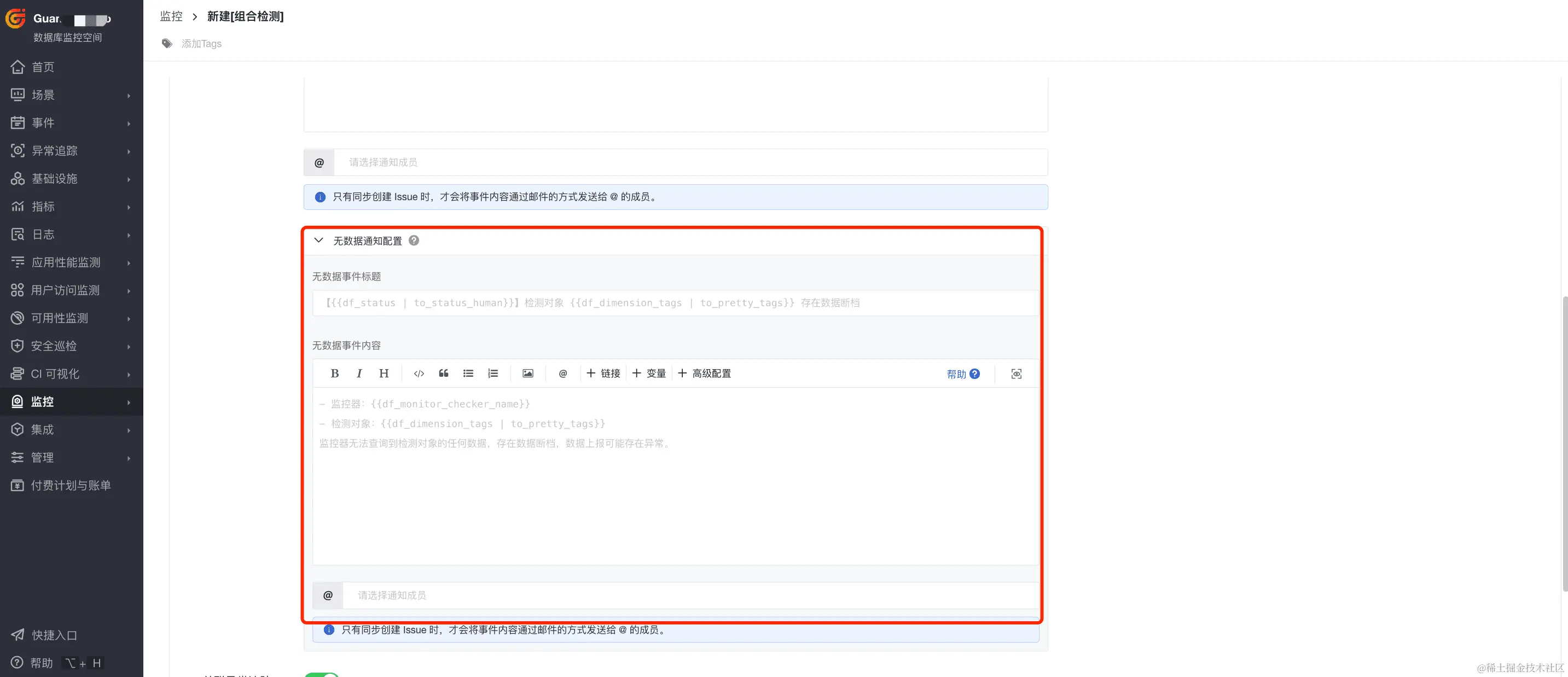 注意:最新版本中监控器名称将由事件标题输入后同步生成。旧的监控器中可能存在监控器名称和事件标题不一致的情况,为了给您更好的使用体验,请尽快同步至最新。