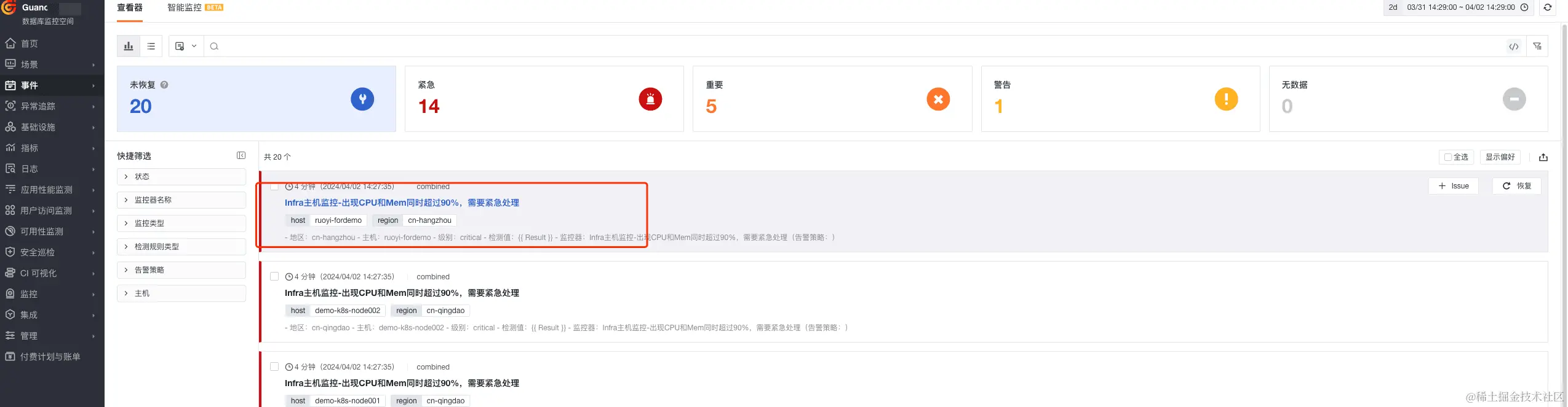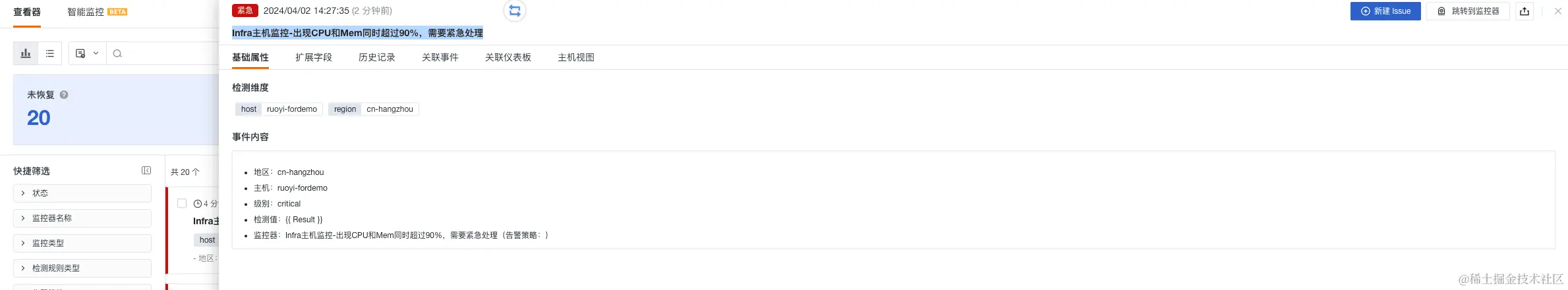 - 组合监控 Infra 主机监控-出现 CPU 和 Mem 同时超过 90%