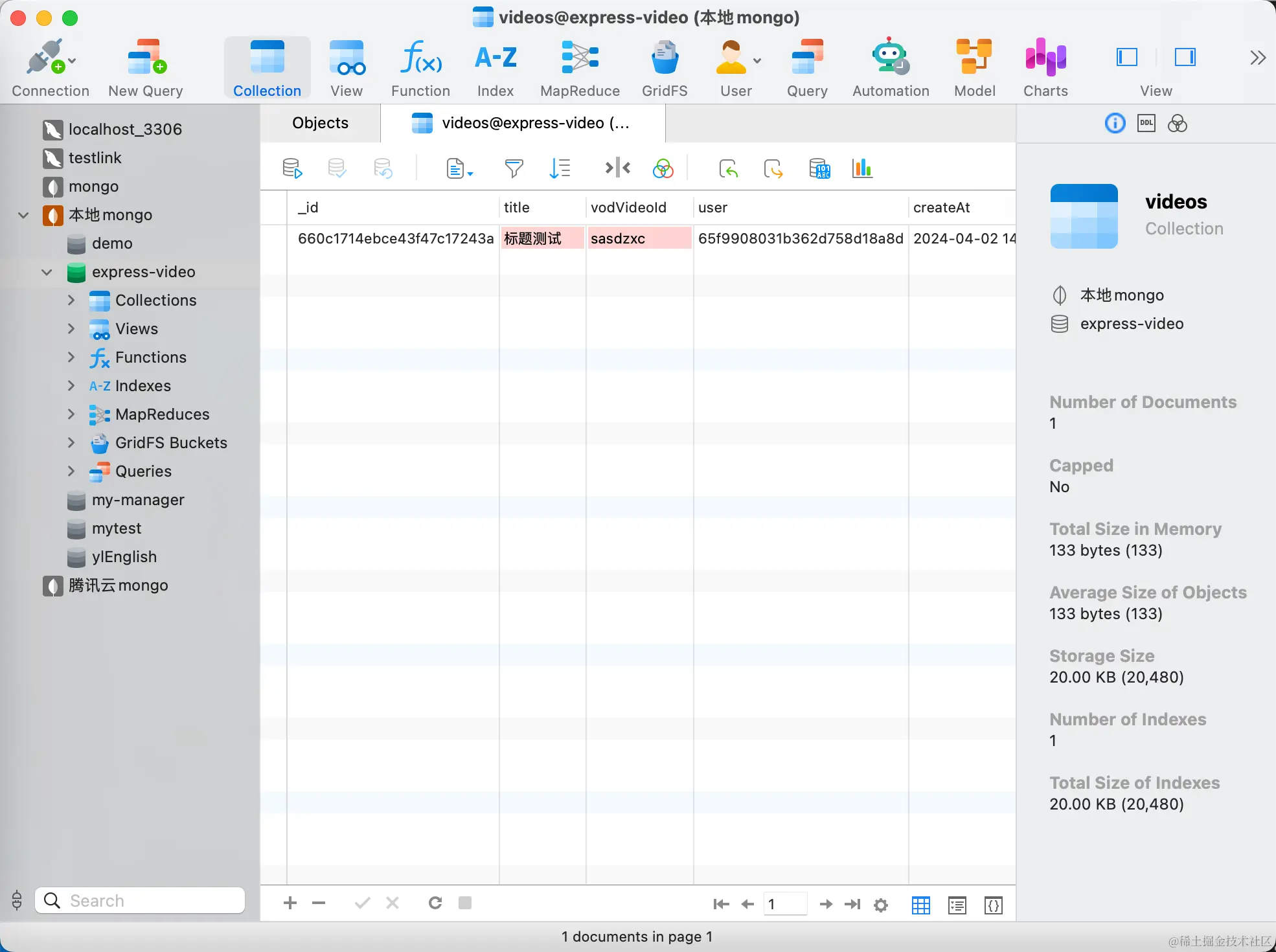 通过以上步骤,我们成功创建了一个简单的API来管理视频上传信息。这不仅展示了如何在Node.js应用中使用Mongoose进行数据库操作,也提供了一个实用的例子来处理和存储视频信息。希望这篇文章能帮助你在构建视频相关应用时,更高效地管理视频内容。